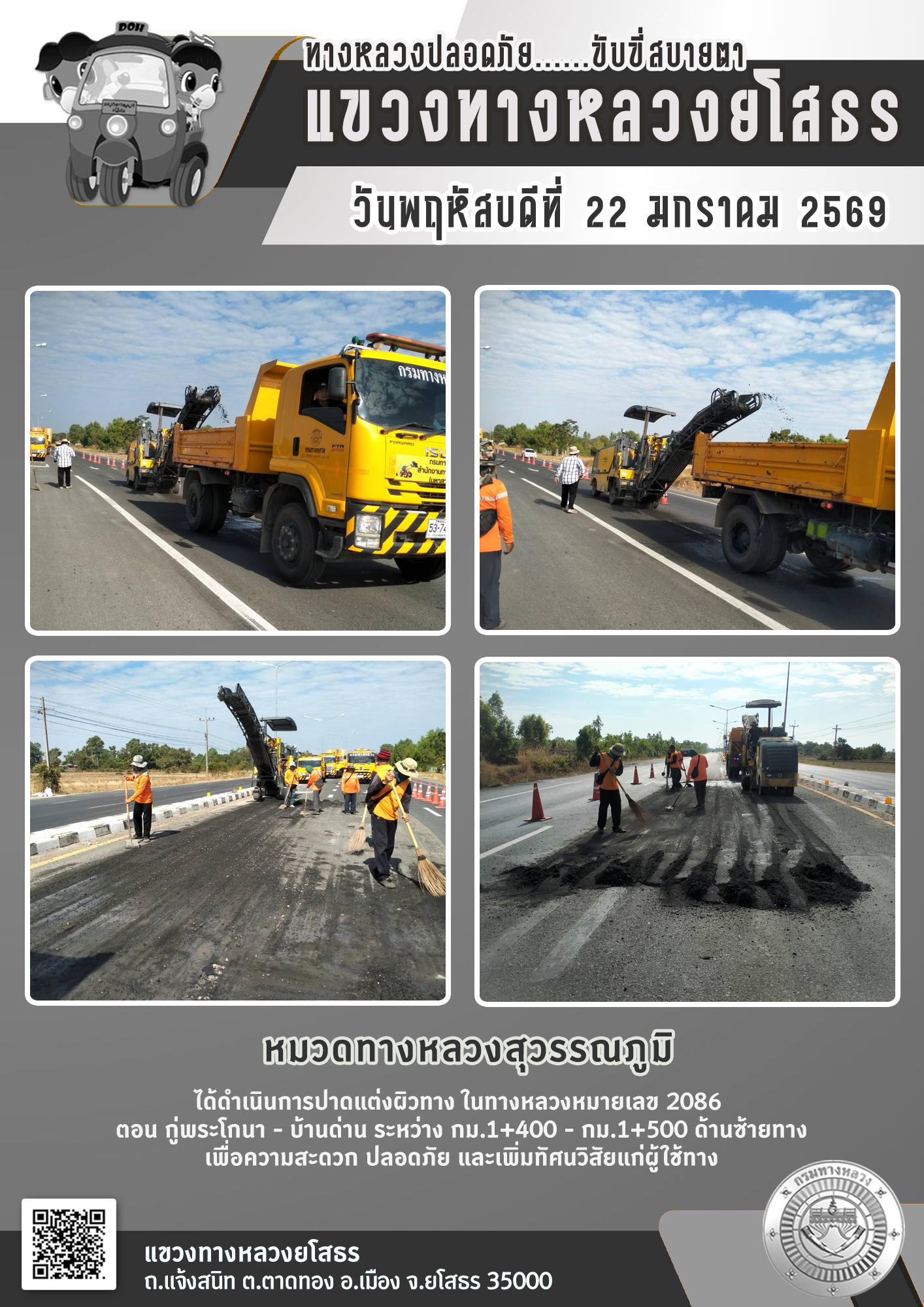 วันพฤหัสบดีที่ 22 มกราคม 2569 หมวดทางหลวงสุวรรณภูมิ ได้ดำเนินการปาดแต่งผิวทาง ในทางหลวงหมายเลข 2086 ตอน กู่พระโกนา - บ้านด่าน ระหว่าง กม.1+400 - กม.1+500 ด้านซ้ายทาง เพื่อความสะดวก ปลอดภัย และเพิ่มทัศนวิสัยแก่ผู้ใช้ทาง