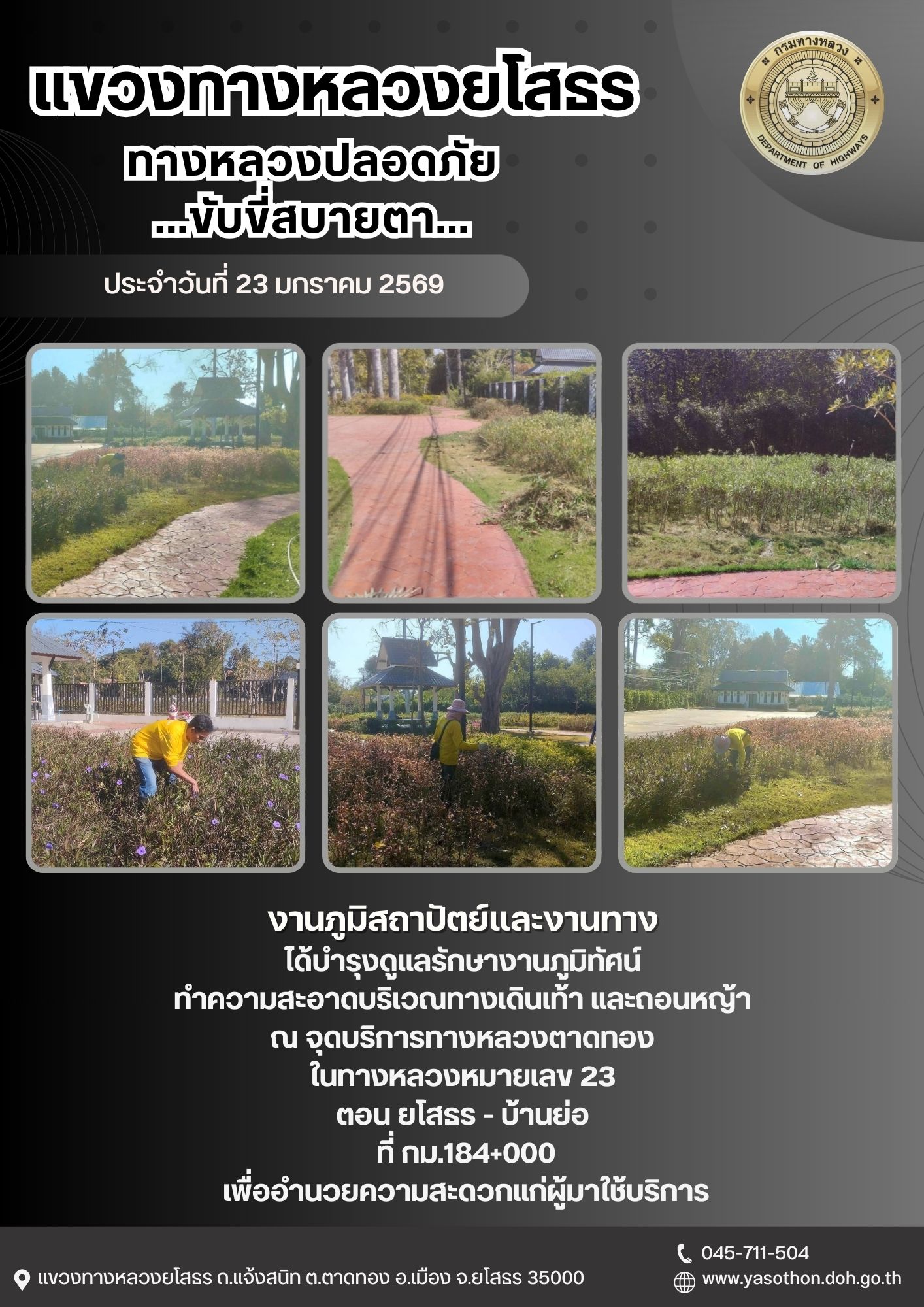 - [09:58] ทั่วไป วันที่ 23 มกราคม 2569 งานภูมิสถาปัตย์และงานทาง ได้บำรุงดูแลรักษางานภูมิทัศน์ ทำความสะอาดบริเวณทางเดินเท้า และถอนหญ้า ณ จุดบริการทางหลวงตาดทอง ในทางหลวงหมายเลข 23 ตอน ยโสธร - บ้านย่อ ที่ กม.184+000 เพื่ออำนวยความสะดวกแก่ผู้มาใช้บริการ