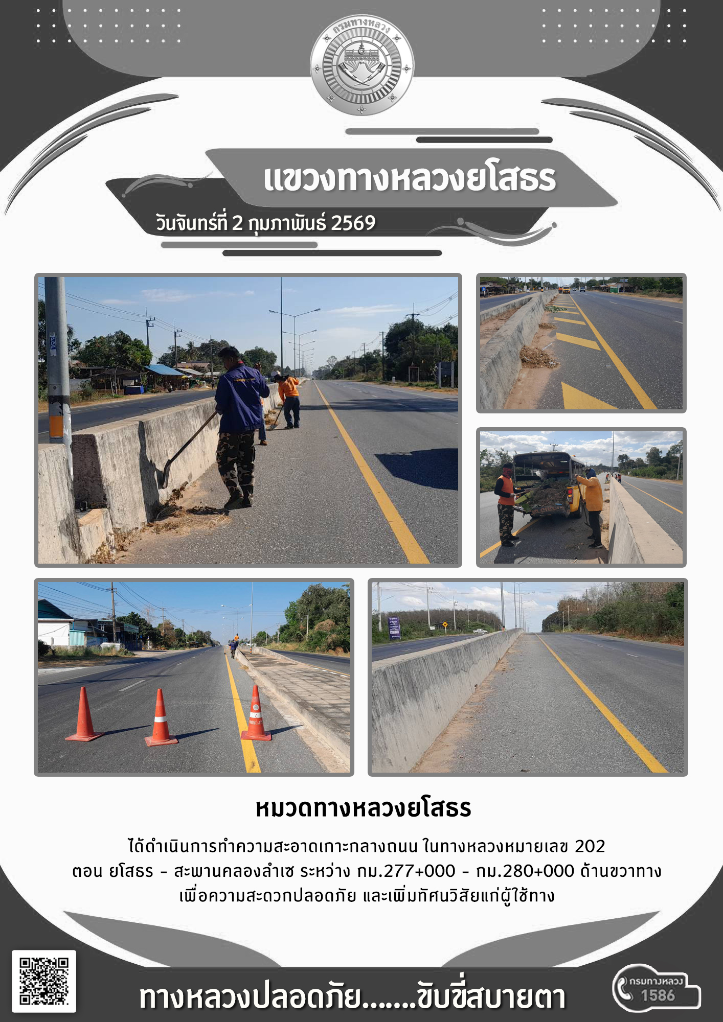 วันจันทร์ที่ 2 กุมภาพันธ์ 2569 หมวดทางหลวงยโสธร ได้ดำเนินการทำความสะอาดเกาะกลางถนน ในทางหลวงหมายเลข 202 ตอน ยโสธร - สะพานคลองลำเซ ระหว่าง กม.277+000 - กม.280+000 ด้านขวาทาง เพื่อความสะดวกปลอดภัย และเพิ่มทัศนวิสัยแก่ผู้ใช้ทาง