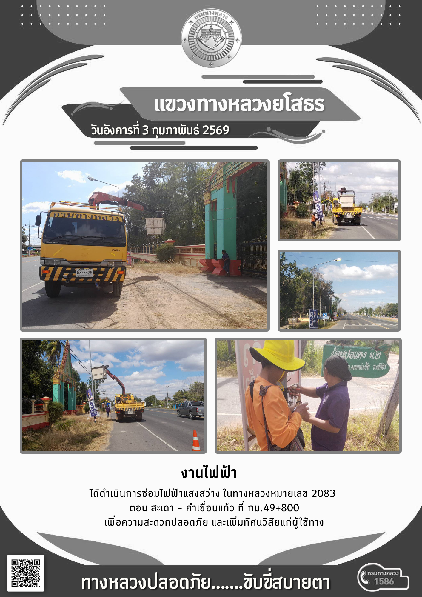 วันอังคารที่ 3 กุมภาพันธ์ 2569 งานไฟฟ้า ได้ดำเนินการซ่อมไฟฟ้าแสงสว่าง ในทางหลวงหมายเลข 2083 ตอน สะเดา - คำเขื่อนแก้ว ที่ กม.49+800 เพื่อความสะดวกปลอดภัย และเพิ่มทัศนวิสัยแก่ผู้ใช้ทาง