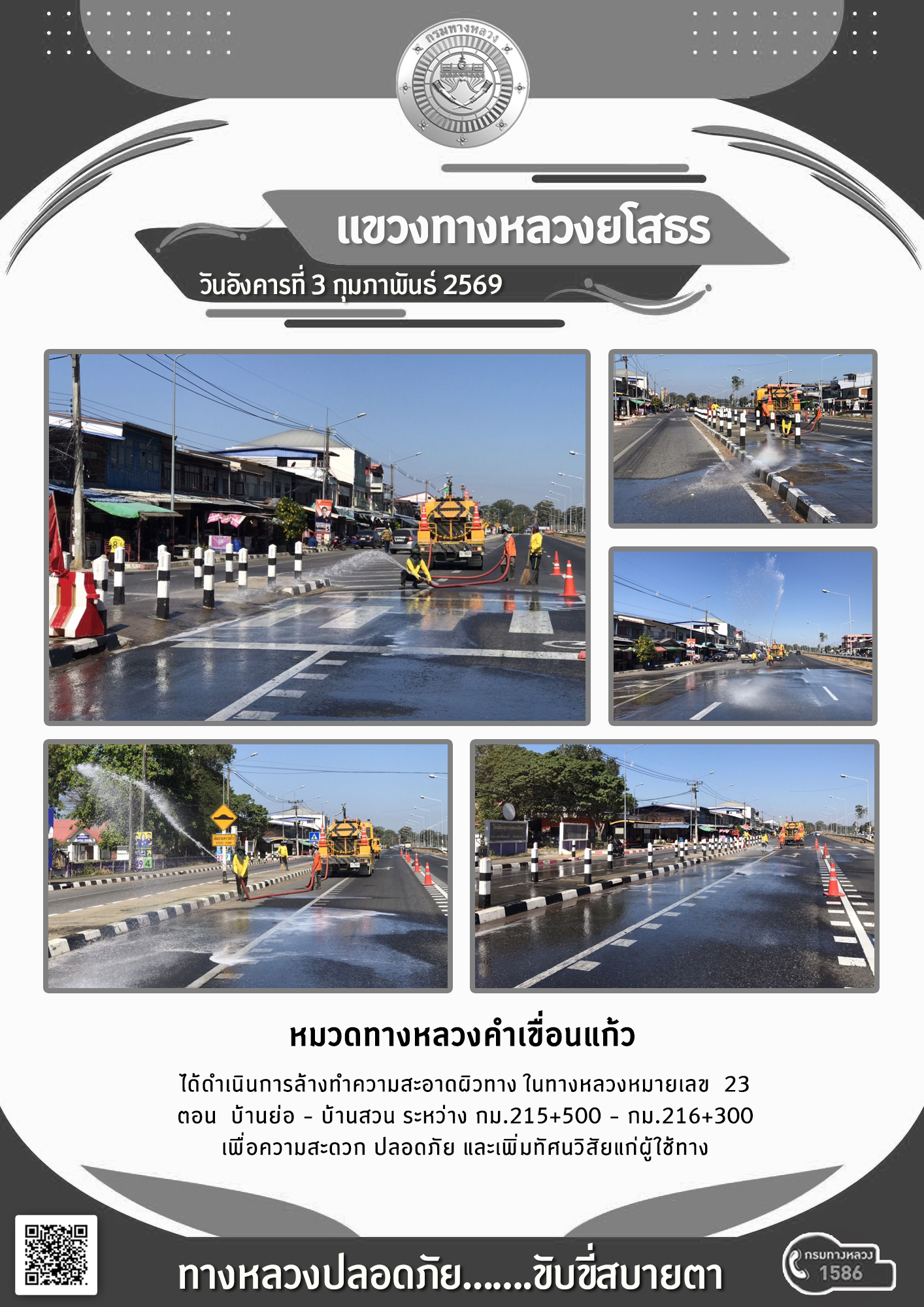 - [09:55] ทั่วไป วันพฤหัสบดีที่ 19 มีนาคม 2569 หมวดทางหลวงยโสธร ได้ดำเนินการทาสีราวกันอันตราย ในทางหลวงหมายเลข 292 ตอน ทางเลี่ยงเมืองยโสธร ระหว่าง กม.5+500 - กม.5+700 เพื่อความสะดวกปลอดภัย และเพิ่มทัศนวิสัยแก่ผู้ใช้ทาง