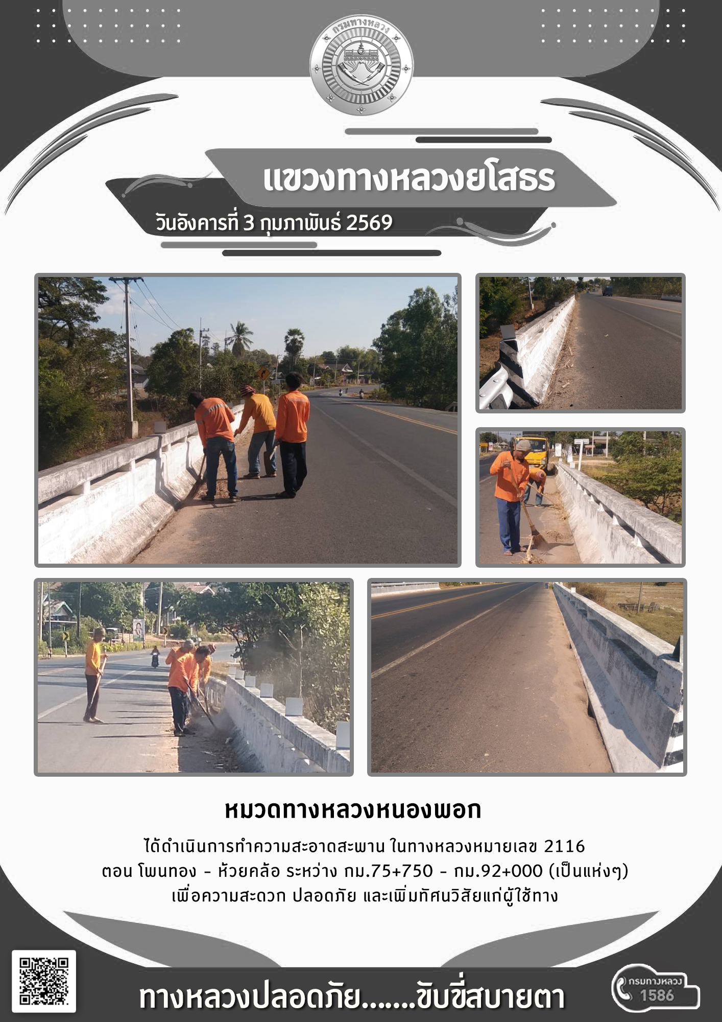 วันอังคารที่ 3 กุมภาพันธ์ 2569 หมวดทางหลวงหนองพอก ได้ดำเนินการทำความสะอาดสะพาน ในทางหลวงหมายเลข 2116 ตอน โพนทอง - หัวยคล้อ ระหว่าง กม.75+750 - กม.92+000 (เป็นแห่งๆ) เพื่อความสะดวก ปลอดภัย และเพิ่มทัศนวิสัยแก่ผู้ใช้ทาง