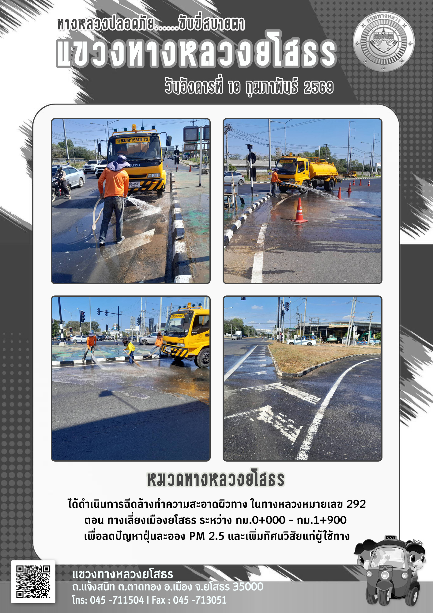 วันอังคารที่ 10 กุมภาพันธ์ 2569 หมวดทางหลวงยโสธร ได้ดำเนินการฉีดล้างทำความสะอาดผิวทาง ในทางหลวงหมายเลข 292 ตอน ทางเลี่ยงเมืองยโสธร ระหว่าง กม.0+000 - กม.1+900 เพื่อลดปัญหาฝุ่นละออง PM 2.5 และเพิ่มทัศนวิสัยแก่ผู้ใช้ทาง