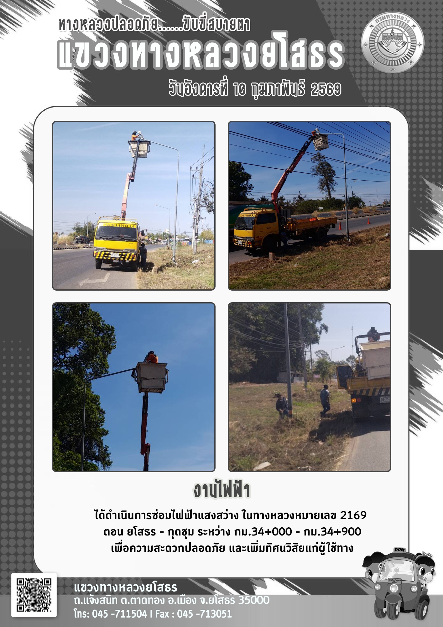 วันอังคารที่ 10 กุมภาพันธ์ 2569 งานไฟฟ้า ได้ดำเนินการซ่อมไฟฟ้าแสงสว่าง ในทางหลวงหมายเลข 2169 ตอน ยโสรร - กุดชุม ระหว่าง กม.34+000 - กม.34+900 เพื่อความสะดวกปลอดภัย และเพิ่มทัศนวิสัยแก่ผู้ใช้ทาง