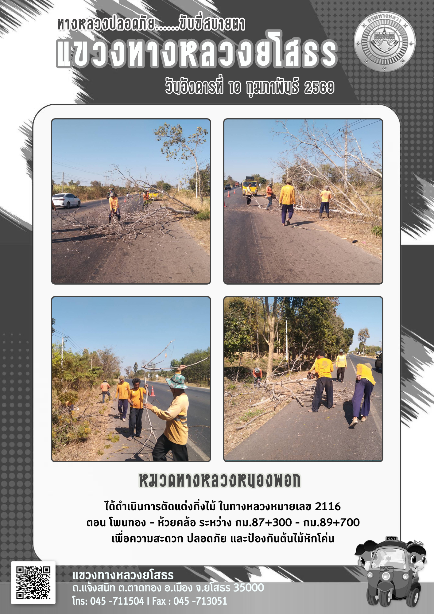วันอังคารที่ 10 กุมภาพันธ์ 2569 หมวดทางหลวงหนองพอก ได้ดำเนินการตัดแต่งกิ่งไม้ ในทางหลวงหมายเลข 2116 ตอน โพนทอง - ห้วยคล้อ ระหว่าง กม.87+300 - กม.89+700 เพื่อความสะดวก ปลอดภัย และป้องกันต้นไม้หักโค่น