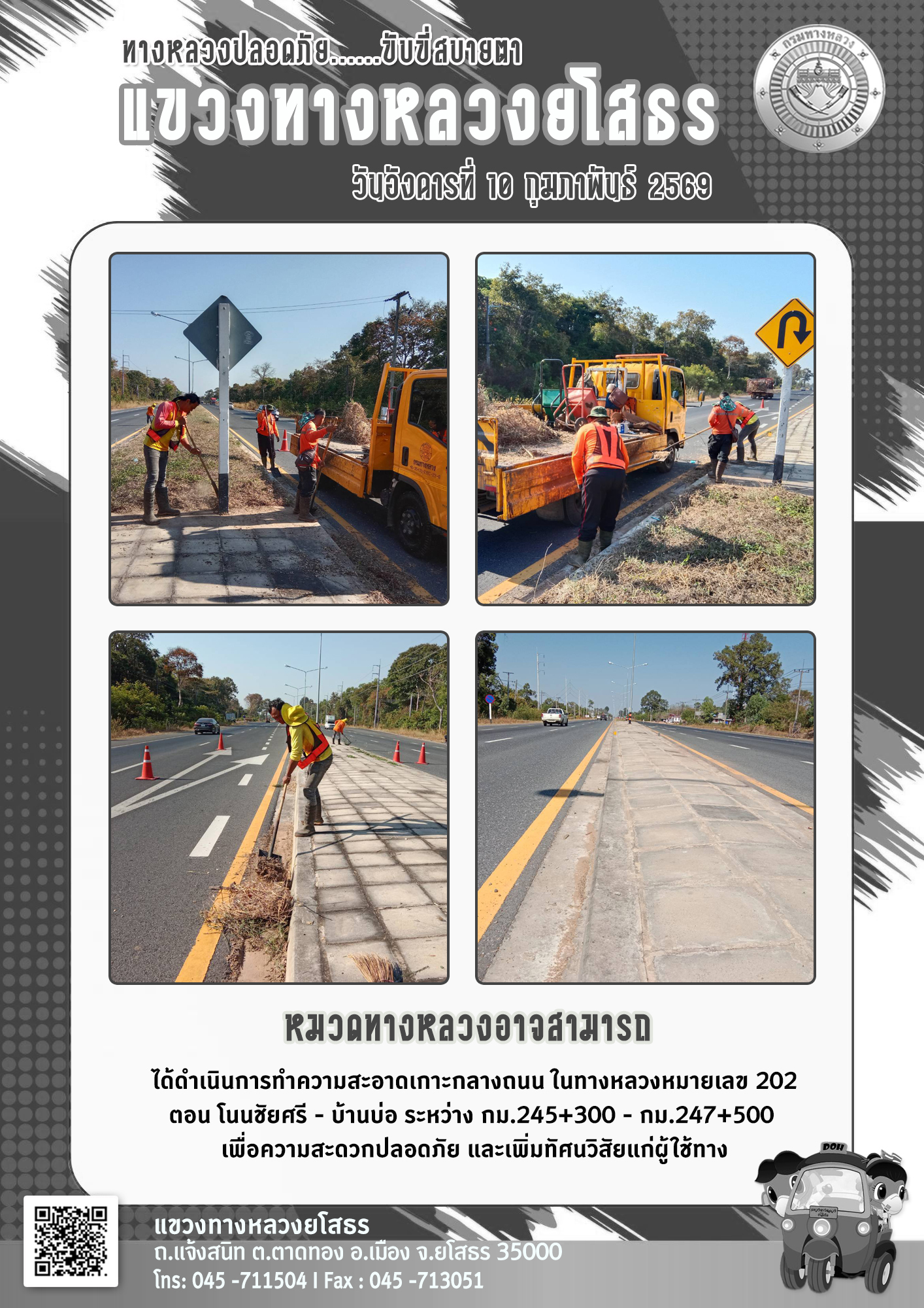 - [10:48] ทั่วไป วันที่ 12 กุมภาพันธ์ 2569 หมวดทางหลวงยโสธร ได้ดำเนินการทำความสะอาดทางเท้า ในทางหลวงหมายเลข 23 ตอน ยโสธร - บ้านย่อ ระหว่าง กม.175+527 - กม.175+852 เพื่อความสะดวกปลอดภัย และเพิ่มทัศนวิสัยแก่ผู้ใช้ทาง