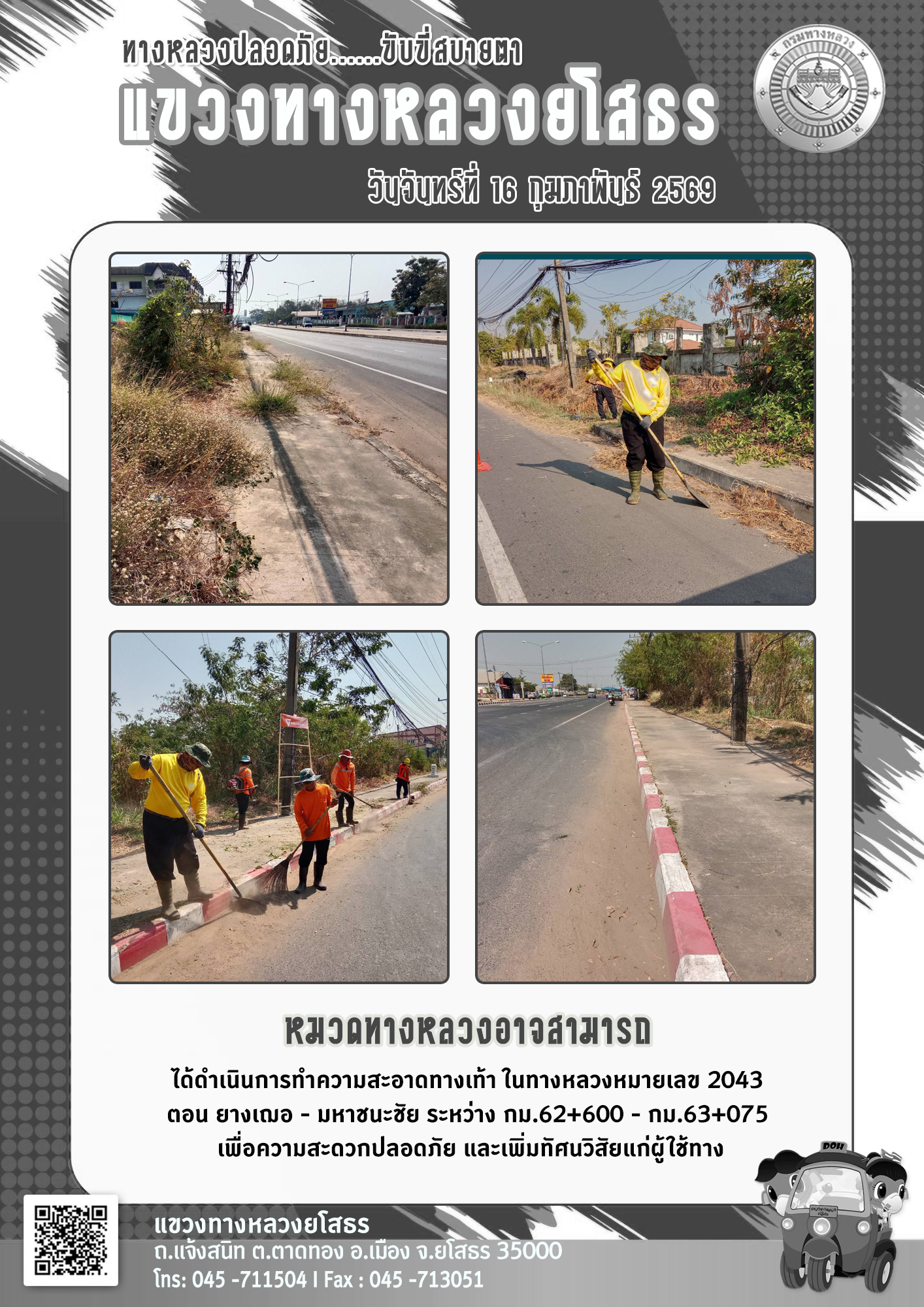 - [11:20] ทั่วไป วันอังคารที่ 24 กุมภาพันธ์ 2569 หมวดทางหลวงอาจสามารถ ได้ดำเนินการทำความสะอาดทางเท้า ในทางหลวงหมายเลข 2043 ตอน ยางเฌอ - มหาชนะชัย ระหว่าง กม.63+500 - กม.63+925 เพื่อความสะดวกปลอดภัย และเพิ่มทัศนวิสัยแก่ผู้ใช้ทาง