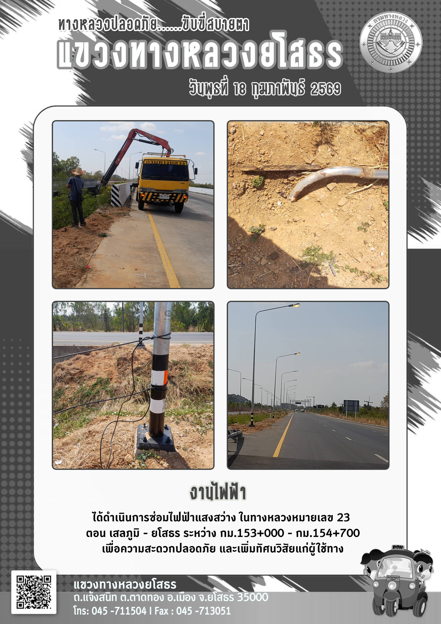 วันพุธที่ 18 กุมภาพันธ์ 2569 งานไฟฟ้า ได้ดำเนินการซ่อมไฟฟ้าแสงสว่าง ในทางหลวงหมายเลข 23 ตอน เสลภูมิ - ยโสธร ระหว่าง กม.153+000 - กม.154+700 เพื่อความสะดวกปลอดภัย และเพิ่มทัศนวิสัยแก่ผู้ใช้ทาง