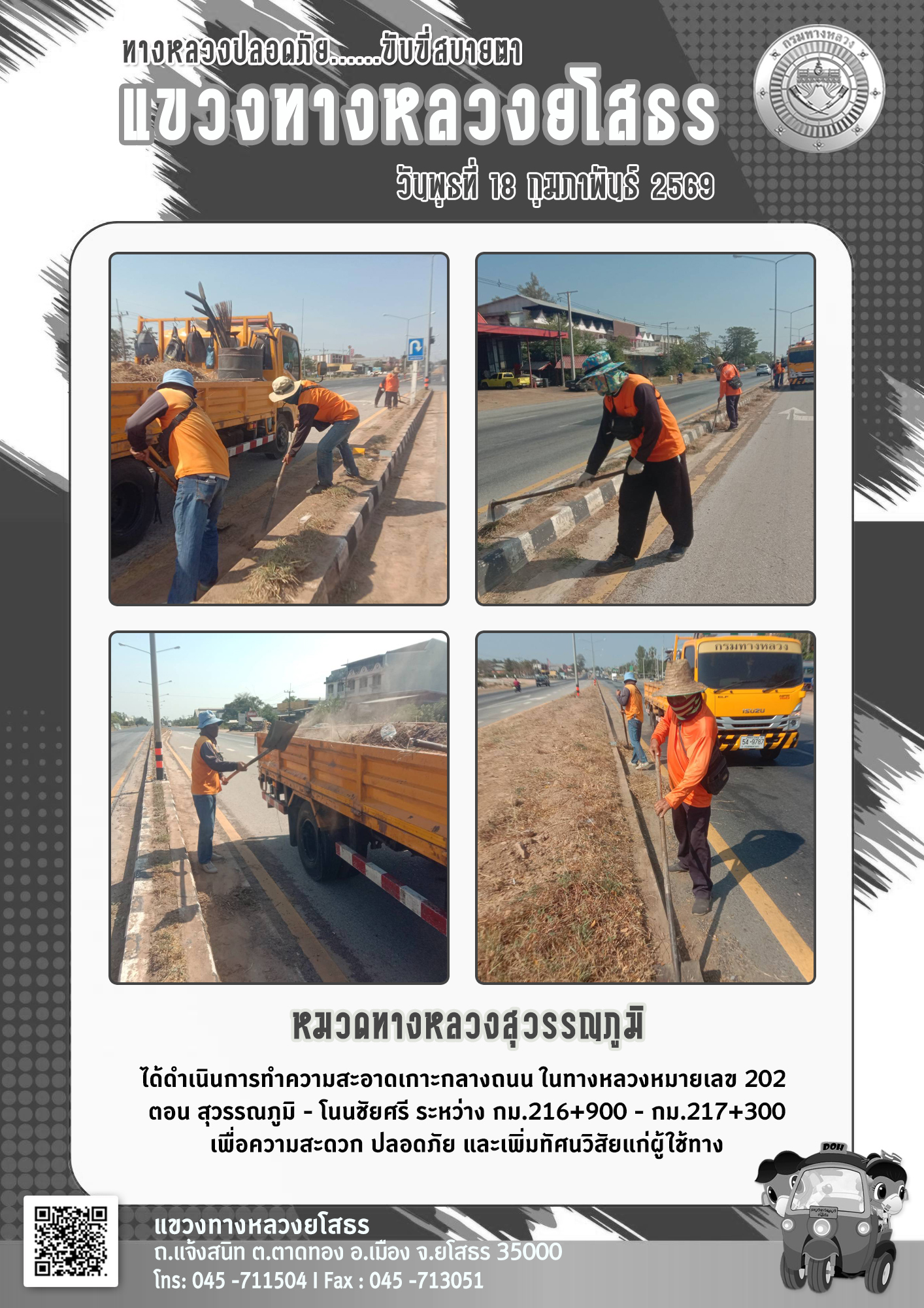 วันพุธที่ 18 กุมภาพันธ์ 2569 หมวดทางหลวงสุวรรณภูมิ ได้ดำเนินการทำความสะอาดเกาะกลางถนน ในทางหลวงหมายเลข 202 ตอน สุวรรณภูมิ - โนนชัยศรี ระหว่าง กม.216+900 - กม.217+300 เพื่อความสะดวก ปลอดภัย และเพิ่มทัศนวิสัยแก่ผู้ใช้ทาง