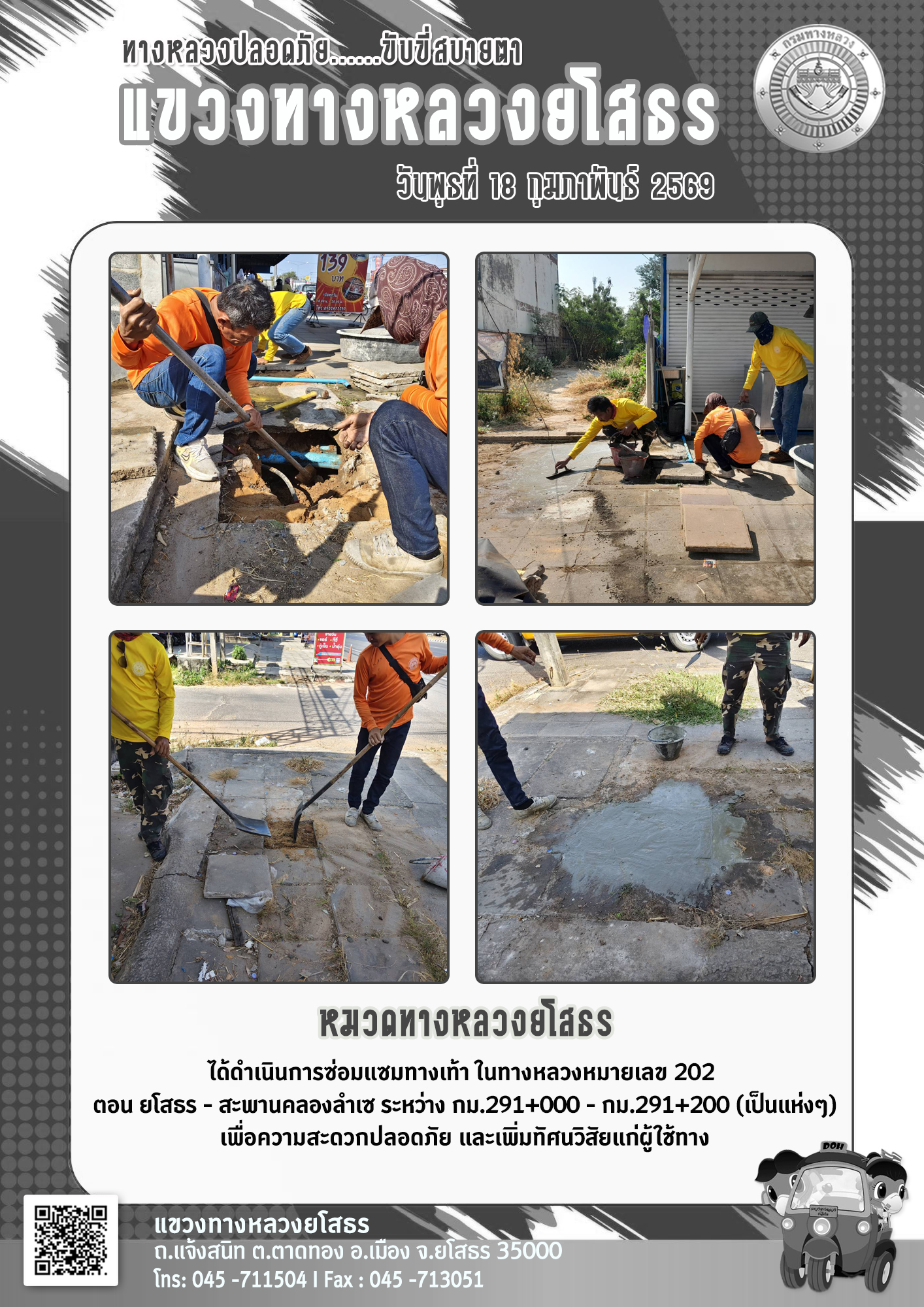 วันพุธที่ 18 กุมภาพันธ์ 2569 หมวดทางหลวงยโสธร ได้ดำเนินการซ่อมแซมทางเท้า ในทางหลวงหมายเลข 202 ตอน ยโสธร - สะพานคลองลำเซ ระหว่าง กม.291+000 - กม.291+200 (เป็นแห่งๆ) เพื่อความสะดวกปลอดภัย และเพิ่มทัศนวิสัยแก่ผู้ใช้ทาง