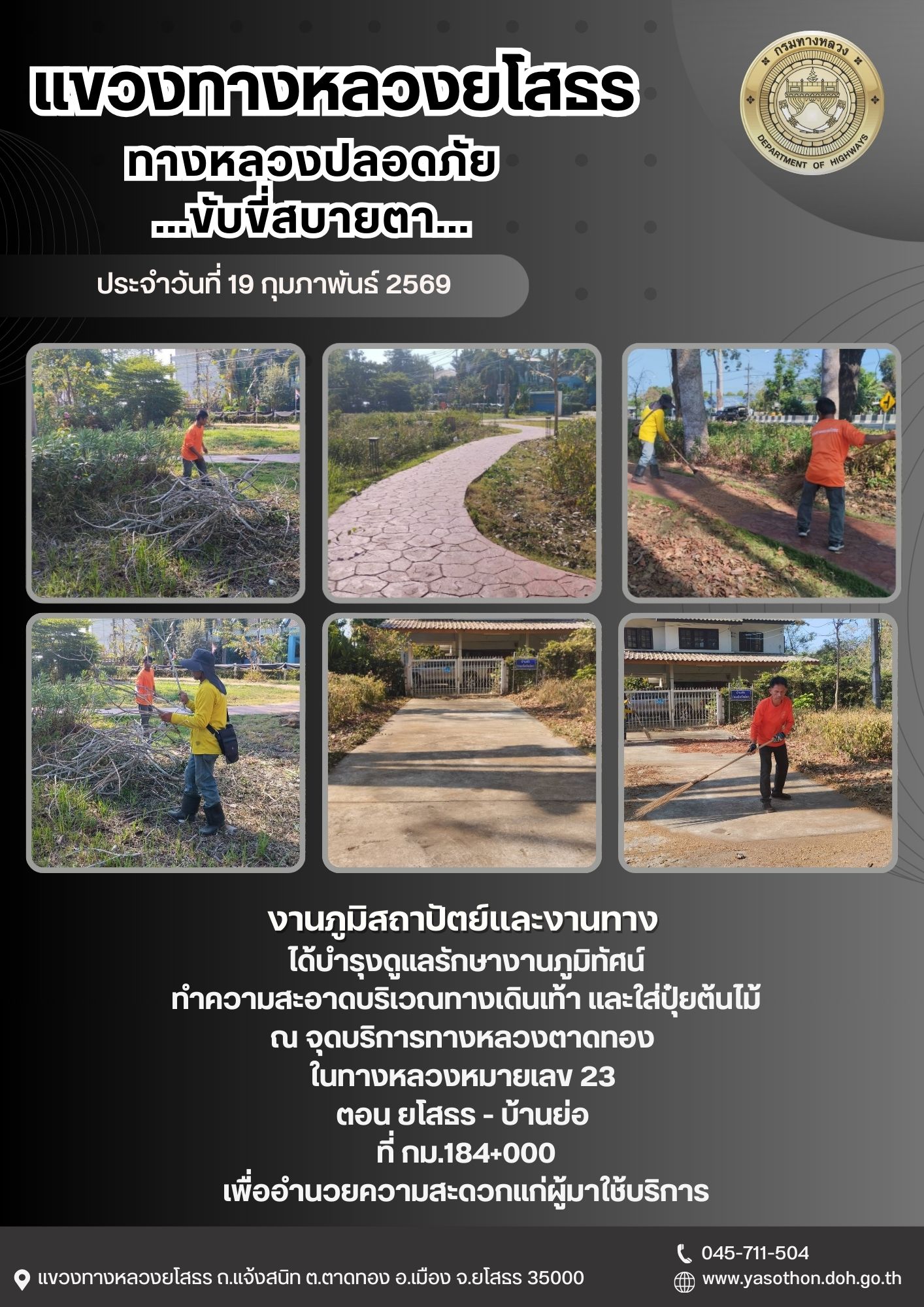 - [15:40] ทั่วไป วันพุธที่ 25 กุมภาพันธ์ 2569 งานภูมิสถาปัตย์และงานทาง ได้บำรุงดูแลรักษางานภูมิทัศน์ และตัดแต่งกิ่งไม้ ณ จุดบริการทางหลวงตาดทอง ในทางหลวงหมายเลข 23 ตอน ยโสธร - บ้านย่อ ที่ กม.184+000 เพื่ออำนวยความสะดวกแก่ผู้มาใช้บริการ