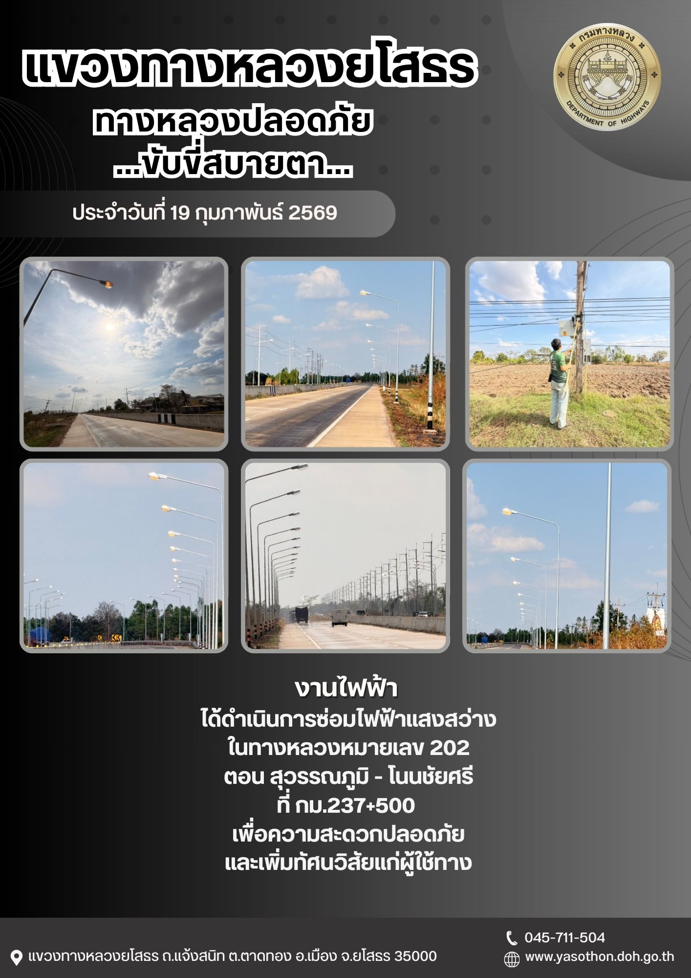 - [15:38] ทั่วไป วันพุธที่ 25 กุมภาพันธ์ 2569 งานไฟฟ้า ได้ดำเนินการซ่อมไฟฟ้าแสงสว่าง ในทางหลวงหมายเลข 2259 ตอน เสลภูมิ - คำโพนสูง ที่ กม.27+000 เพื่อความสะดวกปลอดภัย และเพิ่มทัศนวิสัยแก่ผู้ใช้ทาง