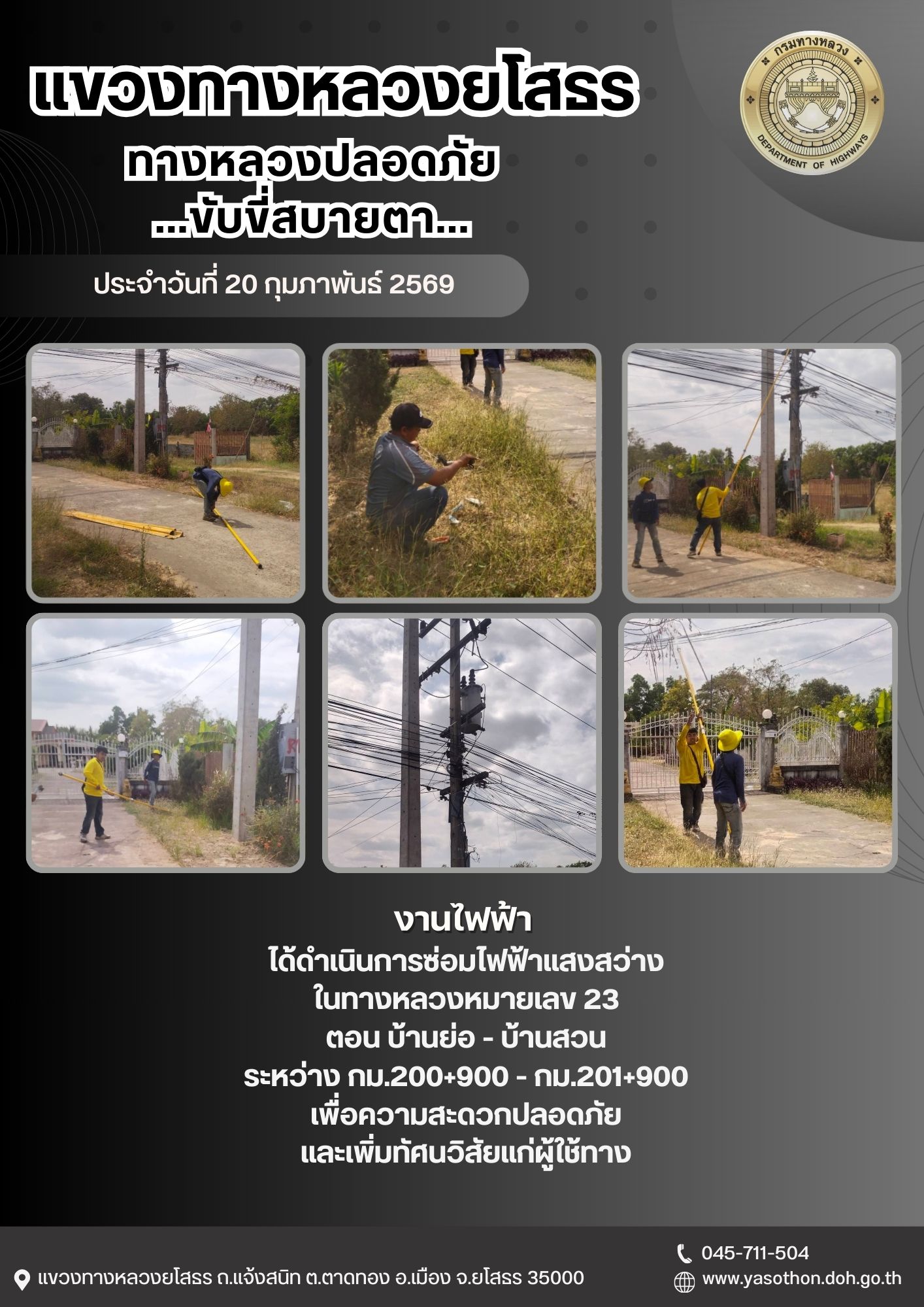 - [09:50] ทั่วไป วันพฤหัสบดีที่ 19 มีนาคม 2569 หมวดทางหลวงยโสธร ได้ดำเนินการติดตั้งเป้าสะท้อนแสงบริเวณขอบเกาะกลางถนน ในทางหลวงหมายเลข 292 ตอน ทางเลี่ยงเมืองยโสธร ระหว่าง กม.3+900 - กม.6+000 เป็นแห่งๆ เพื่อความสะดวกปลอดภัย และเพิ่มทัศนวิสัยแก่ผู้ใช้ทาง