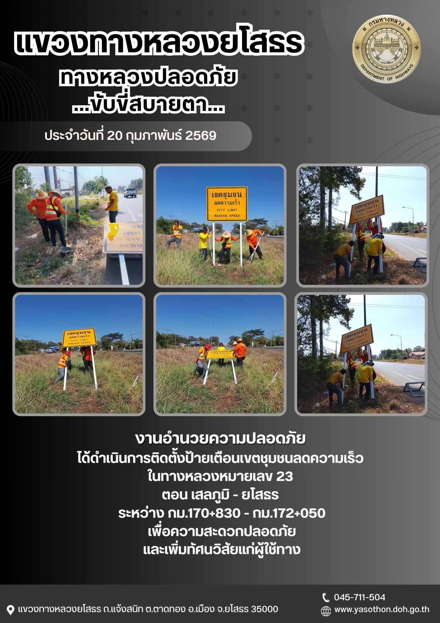 วันที่ 20 กุมภาพันธ์ 2569 งานอำนวยความปลอดภัย ได้ดำเนินการติดตั้งป้ายเตือนเขตชุมชนลดความเร็ว ในทางหลวงหมายเลข 23 ตอน เสลภูมิ - ยโสรร ระหว่าง กม.170+830 - กม.172+050 เพื่อความสะดวกปลอดภัย และเพิ่มทัศนวิสัยแก่ผู้ใช้ทาง
