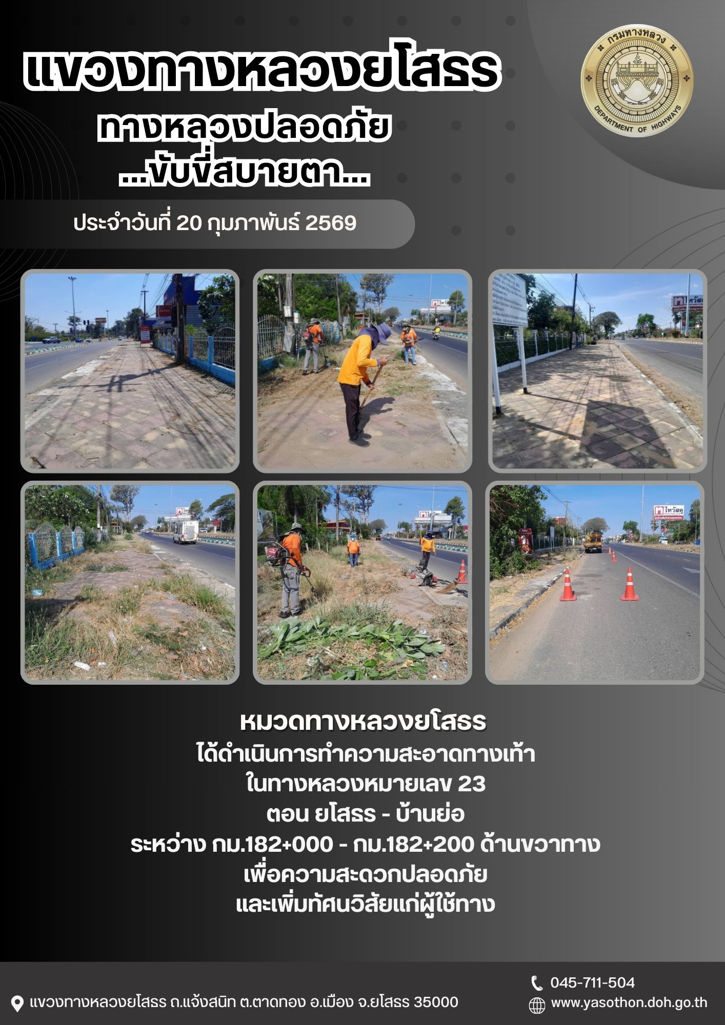 วันที่ 20 กุมภาพันธ์ 2569 หมวดทางหลวงยโสธร ได้ดำเนินการทำความสะอาดทางเท้า ในทางหลวงหมายเลข 23 ตอน ยโสธร - บ้านย่อ ระหว่าง กม.182+000 - กม.182+200 ด้านขวาทาง เพื่อความสะดวกปลอดภัย และเพิ่มทัศนวิสัยแก่ผู้ใช้ทาง