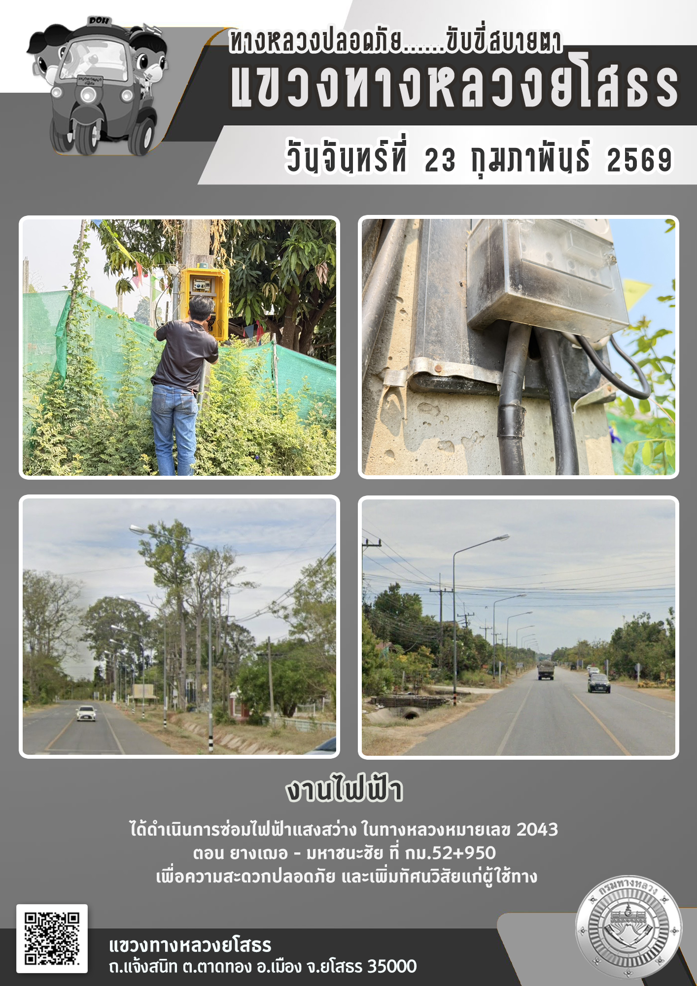 วันจันทร์ที่ 23 กุมภาพันธ์ 2569 งานไฟฟ้า ได้ดำเนินการซ่อมไฟฟ้าแสงสว่าง ในทางหลวงหมายเลข 2043 ตอน ยางเฌอ - มหาชนะชัย ที่ กม.52+950 เพื่อความสะดวกปลอดภัย และเพิ่มทัศนวิสัยแก่ผู้ใช้ทาง