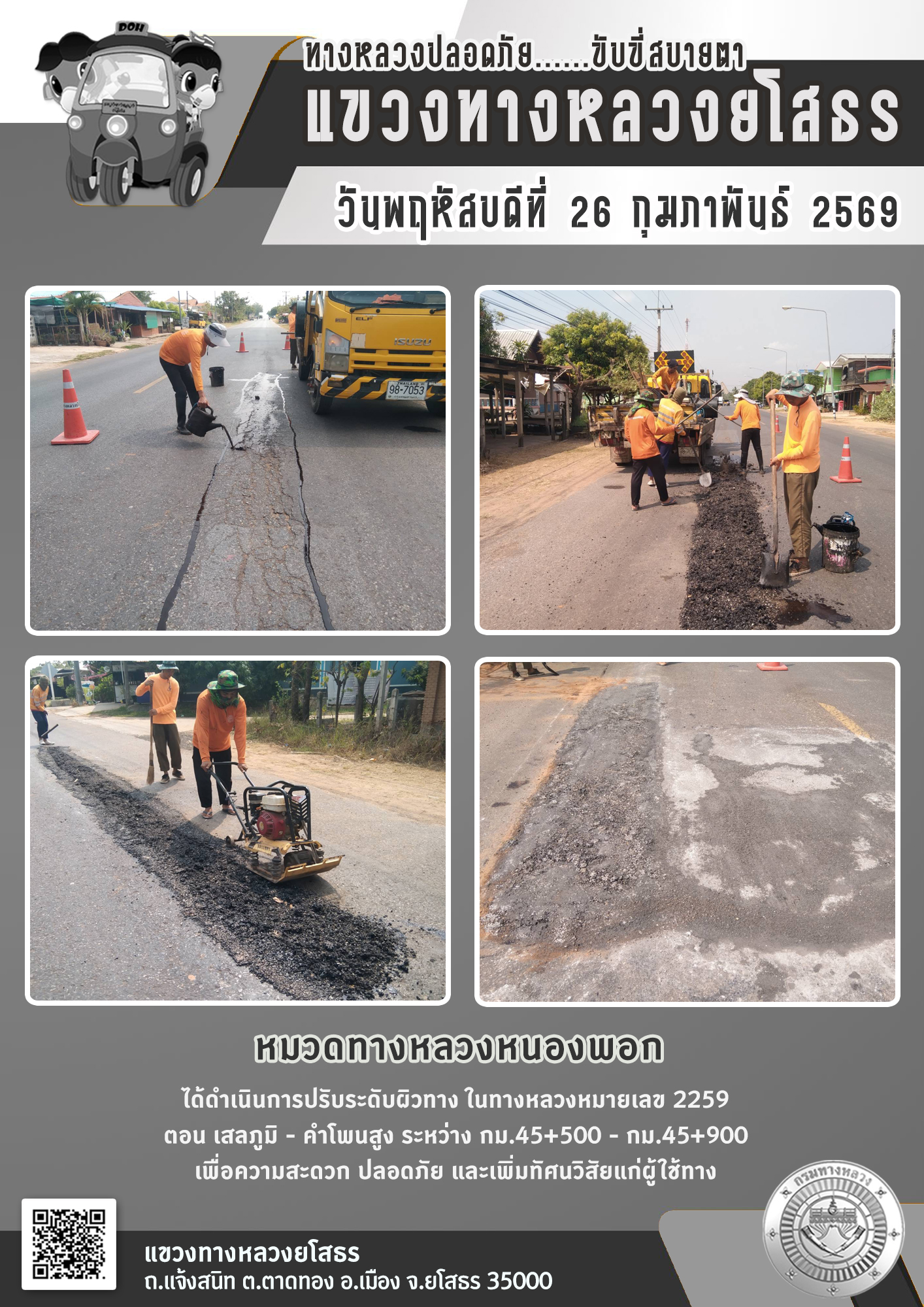 วันพฤหัสบดีที่ 26 กุมภาพันธ์ 2569 หมวดทางหลวงหนองพอก ได้ดำเนินการปรับระดับผิวทาง ในทางหลวงหมายเลข 2259 ตอน เสลภูมิ - คำโพนสูง ระหว่าง กม.45+500 - กม.45+900 เพื่อความสะดวก ปลอดภัย และเพิ่มทัศนวิสัยแก่ผู้ใช้ทาง