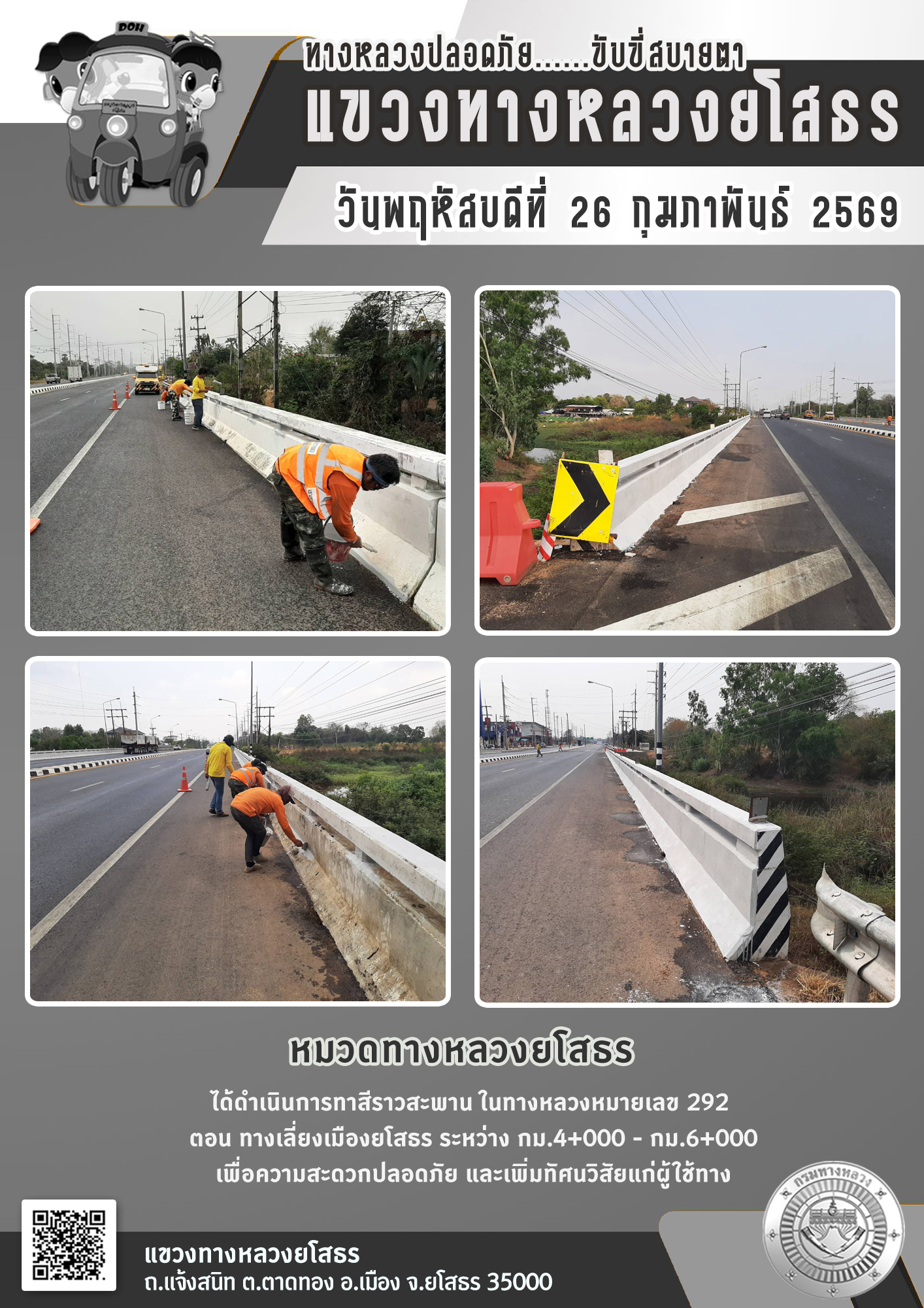 วันพฤหัสบดีที่ 26 กุมภาพันธ์ 2569 หมวดทางหลวงยโสธร ได้ดำเนินการทาสีราวสะพาน ในทางหลวงหมายเลข 292 ตอน ทางเลี่ยงเมืองยโสธร ระหว่าง กม.4+000 - กม.6+000 เพื่อความสะดวกปลอดภัย และเพิ่มทัศนวิสัยแก่ผู้ใช้ทาง