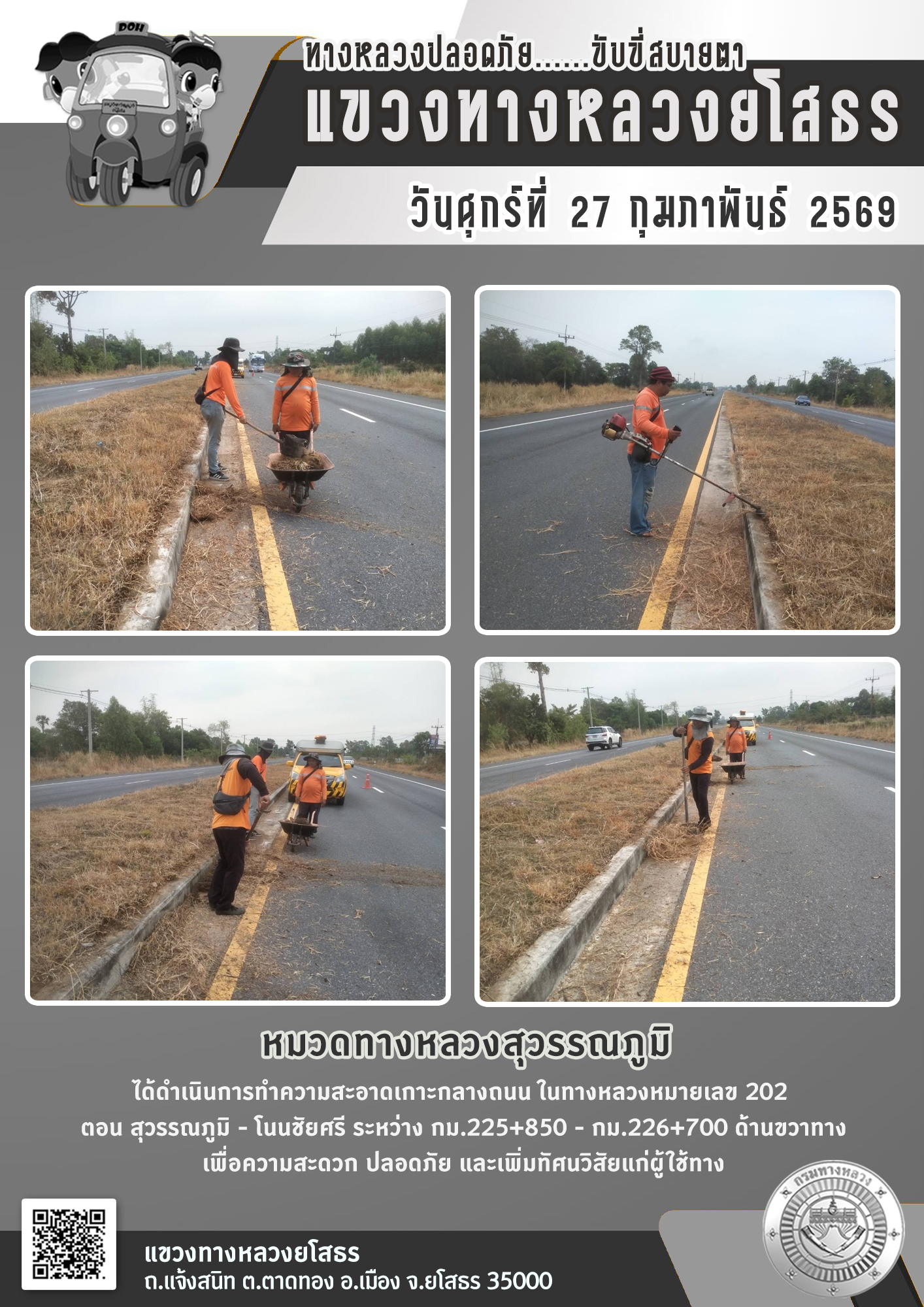 - [10:06] ทั่วไป วันศุกร์ที่ 27 กุมภาพันธ์ 2569 หมวดทางหลวงยโสธร ได้ดำเนินการถางป่าบริเวณไหล่ทาง ในทางหลวงหมายเลข 2169 ตอน ยโสธร - กุดชุม ระหว่าง กม.34+800 - กม.35+000 เพื่อความสะดวกปลอดภัย และเพิ่มทัศนวิสัยแก่ผู้ใช้ทาง