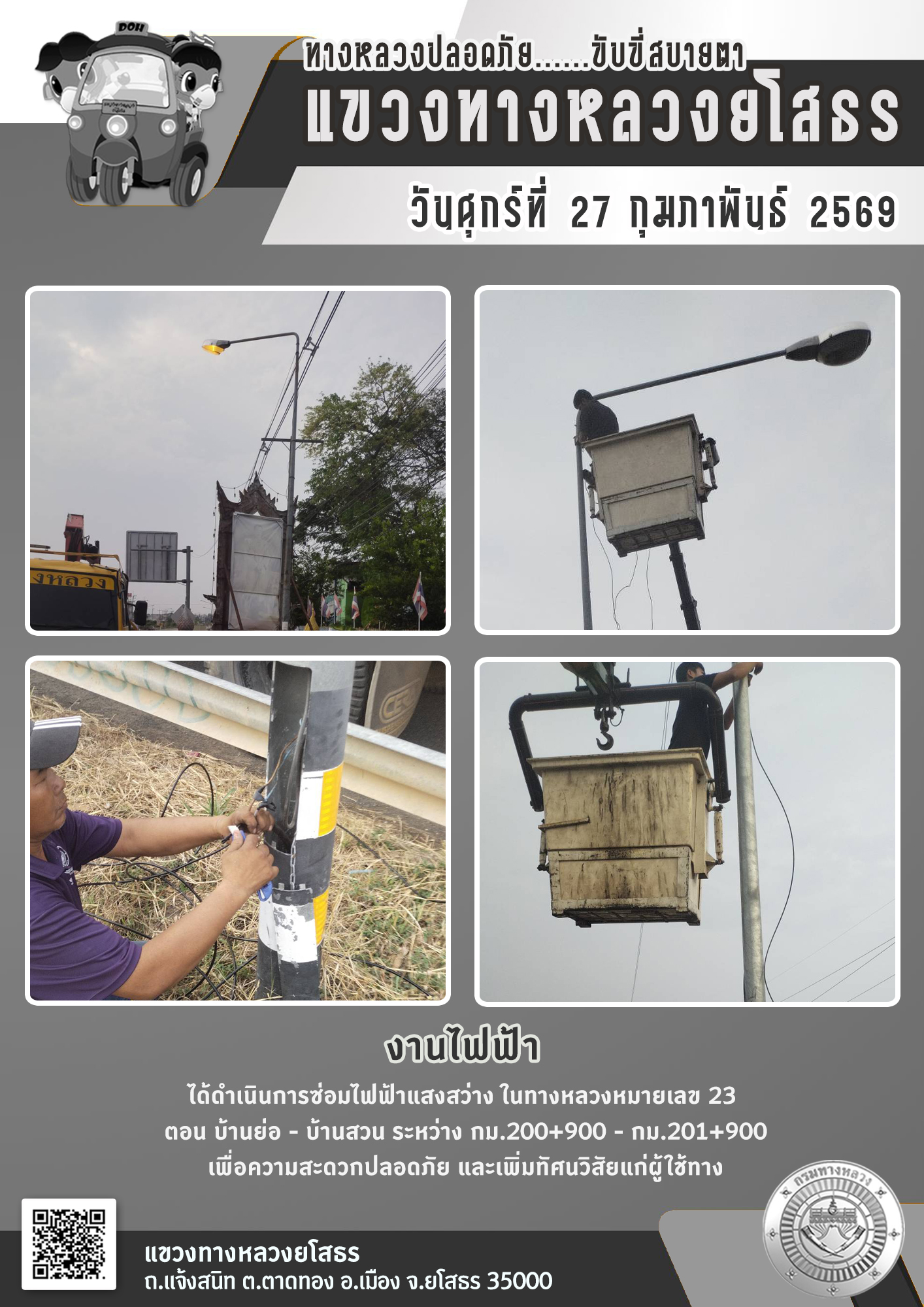 วันศุกร์ที่ 27 กุมภาพันธ์ 2569 งานไฟฟ้า ได้ดำเนินการซ่อมไฟฟ้าแสงสว่าง ในทางหลวงหมายเลข 23 ตอน บ้านย่อ - บ้านสวน ระหว่าง กม.200+900 - กม.201+900 เพื่อความสะดวกปลอดภัย และเพิ่มทัศนวิสัยแก่ผู้ใช้ทาง
