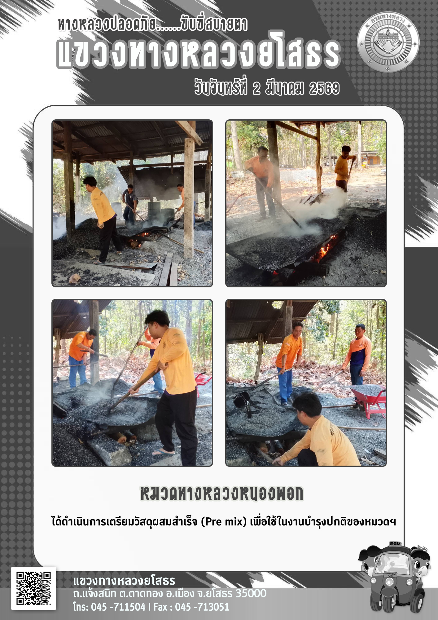 - [11:36] ทั่วไป วันจันทร์ที่ 2 มีนาคม 2569 หมวดทางหลวงหนองพอก ได้ดำเนินการเตรียมวัสดุผสมสำเร็จ (Pre mix) เพื่อใช้ในงานบำรุงปกติของหมวดฯ