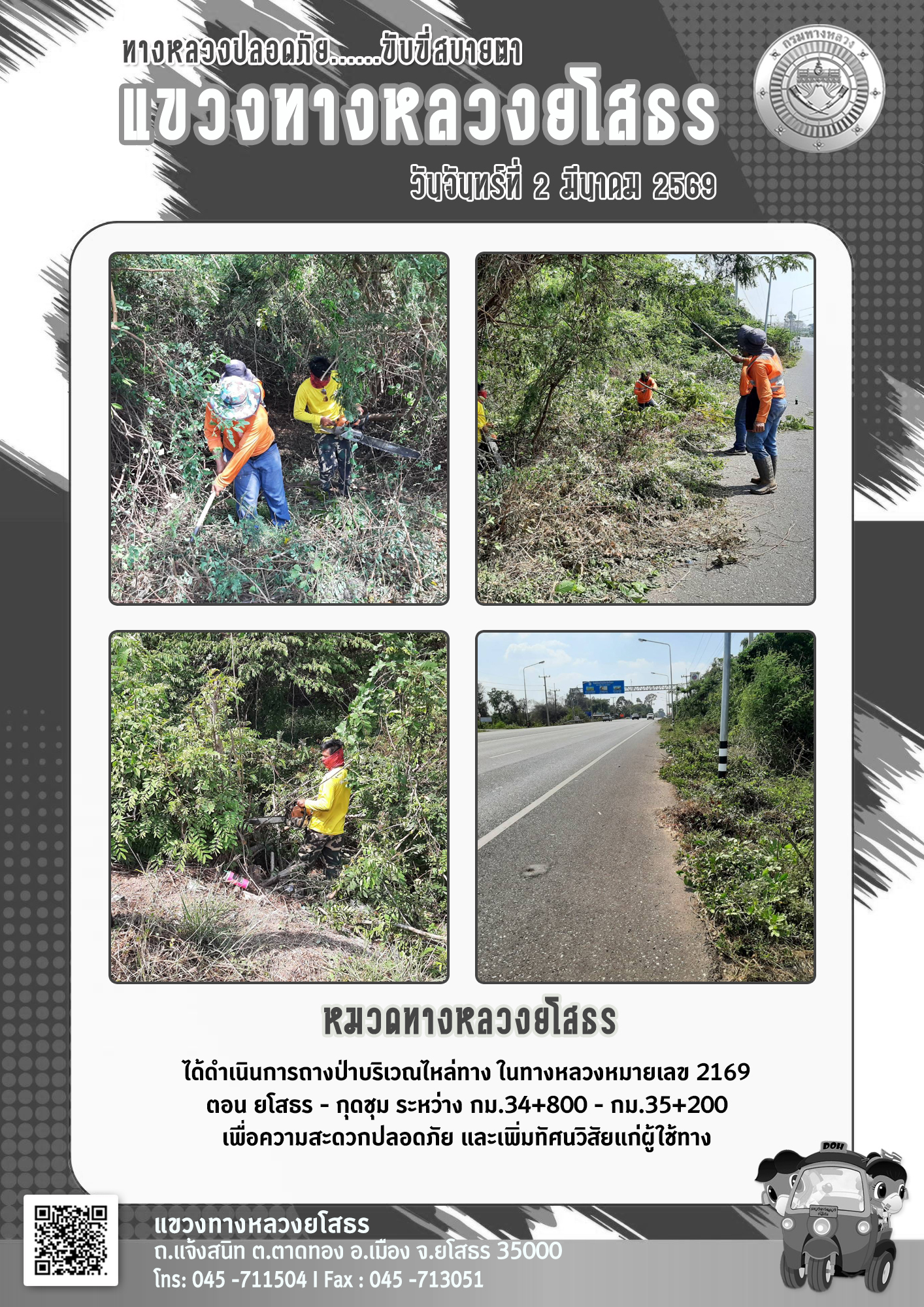 - [11:41] ทั่วไป วันจันทร์ที่ 2 มีนาคม 2569 หมวดทางหลวงยโสธร ได้ดำเนินการถางป่าบริเวณไหล่ทาง ในทางหลวงหมายเลข 2169 ตอน ยโสธร - กุดชุม ระหว่าง กม.34+800 - กม.35+200 เพื่อความสะดวกปลอดภัย และเพิ่มทัศนวิสัยแก่ผู้ใช้ทาง