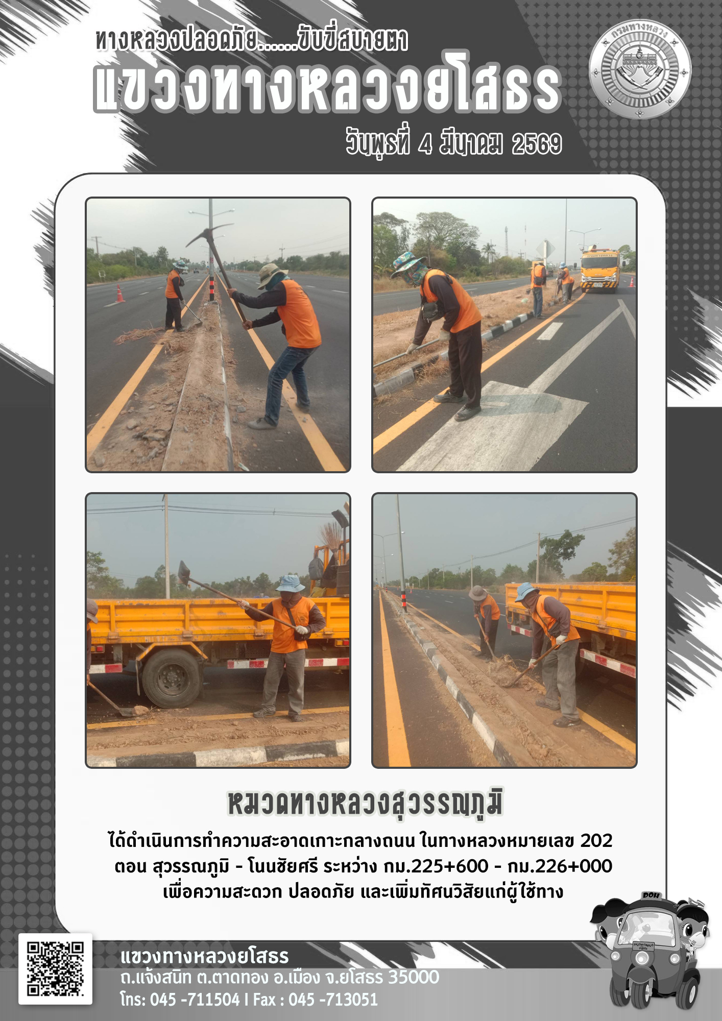 - [10:11] ทั่วไป วันศุกร์ที่ 6 มีนาคม 2569 หมวดทางหลวงยโสธร ได้ดำเนินการขุดลอกร่องระบายน้ำข้างทาง ในทางหลวงหมายเลข 292 ตอน ทางเลี่ยงเมืองยโสธร ระหว่าง กม.0+700 - กม.5+200 (เป็นแห่งๆ) เพื่อเปิดทางระบายน้ำ ป้องกันน้ำท่วมขังผิวทาง