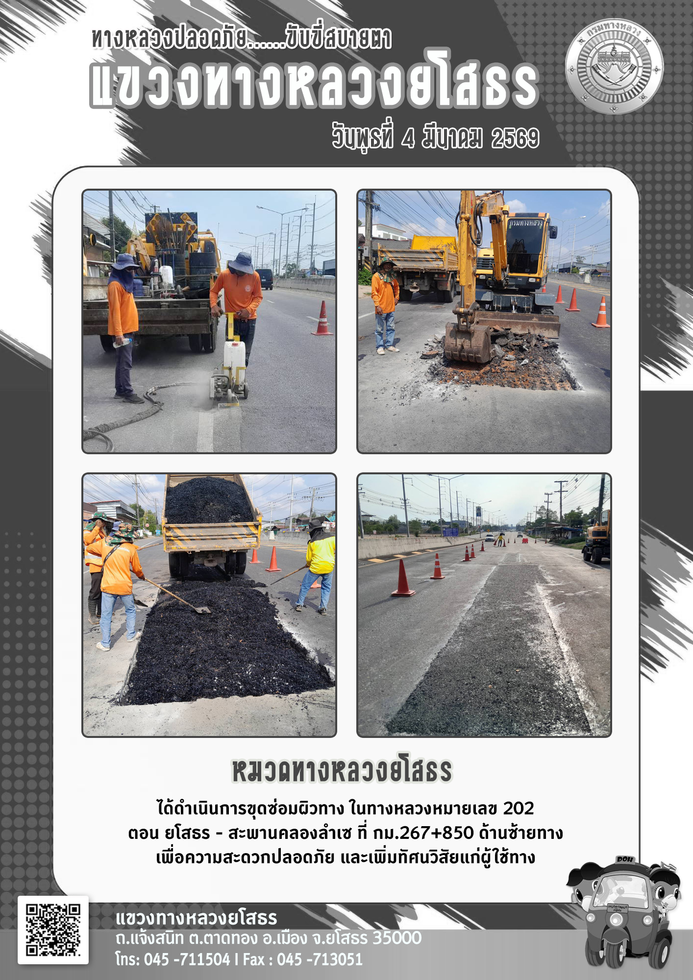 วันพุธที่ 4 มีนาคม 2569 หมวดทางหลวงยโสธร ได้ดำเนินการขุดซ่อมผิวทาง ในทางหลวงหมายเลข 202 ตอน ยโสธร - สะพานคลองลำเซ ที่ กม.267+850 ด้านซ้ายทาง เพื่อความสะดวกปลอดภัย และเพิ่มทัศนวิสัยแก่ผู้ใช้ทาง