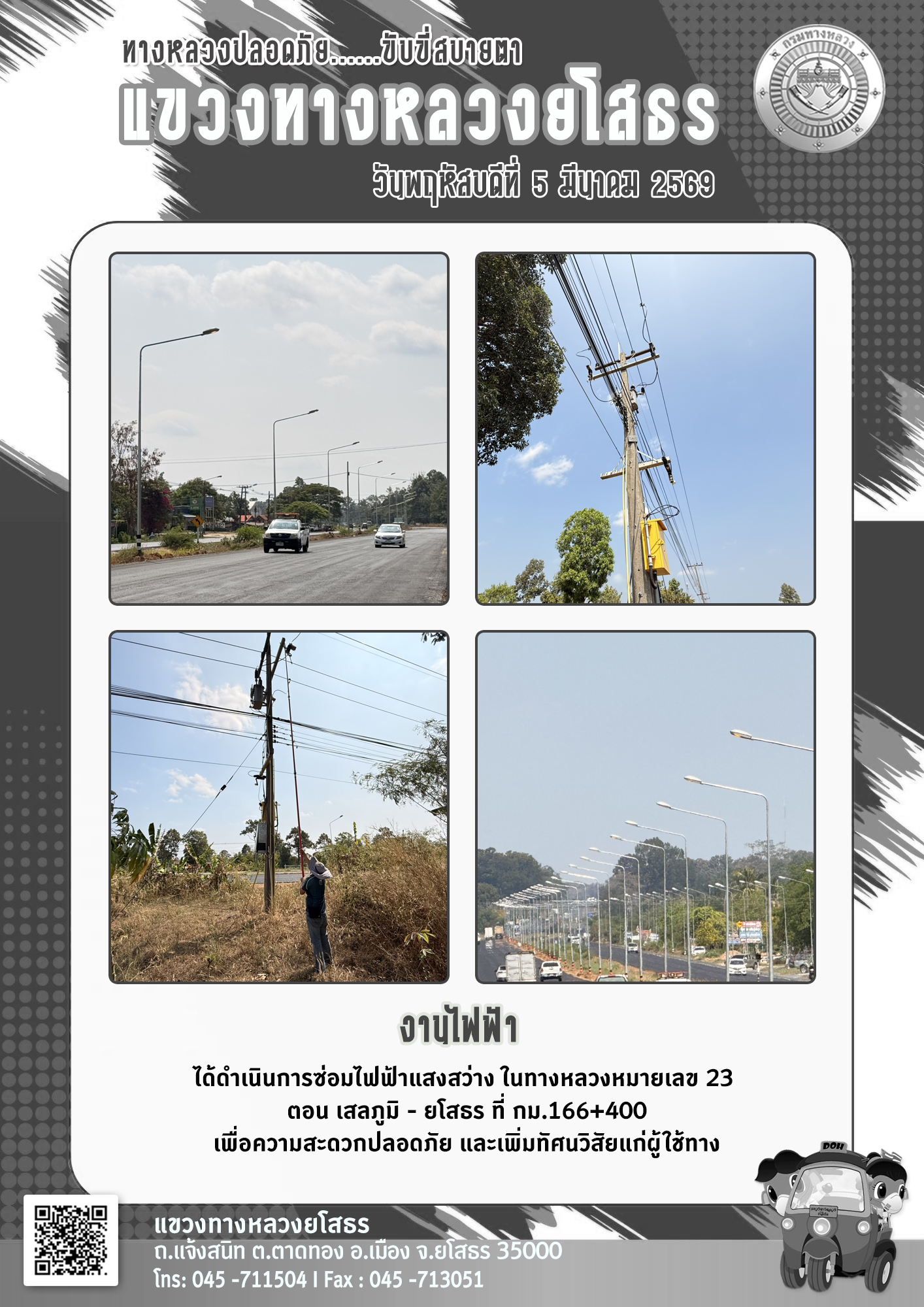 วันพฤหัสบดีที่ 5 มีนาคม 2569 งานไฟฟ้า ได้ดำเนินการซ่อมไฟฟ้าแสงสว่าง ในทางหลวงหมายเลข 23 ตอน เสลภูมิ - ยโสธร ที่ กม.166+400 เพื่อความสะดวกปลอดภัย และเพิ่มทัศนวิสัยแก่ผู้ใช้ทาง