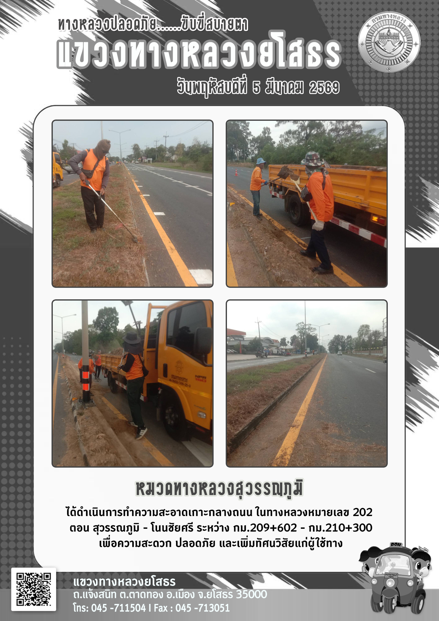 วันพฤหัสบดีที่ 5 มีนาคม 2569 หมวดทางหลวงสุวรรณภูมิ ได้ดำเนินการทำความสะอาดเกาะกลางถนน ในทางหลวงหมายเลข 202 ตอน สุวรรณภูมิ - โนนชัยศรี ระหว่าง กม.209+602 - กม.210+300 เพื่อความสะดวก ปลอดภัย และเพิ่มทัศนวิสัยแก่ผู้ใช้ทาง