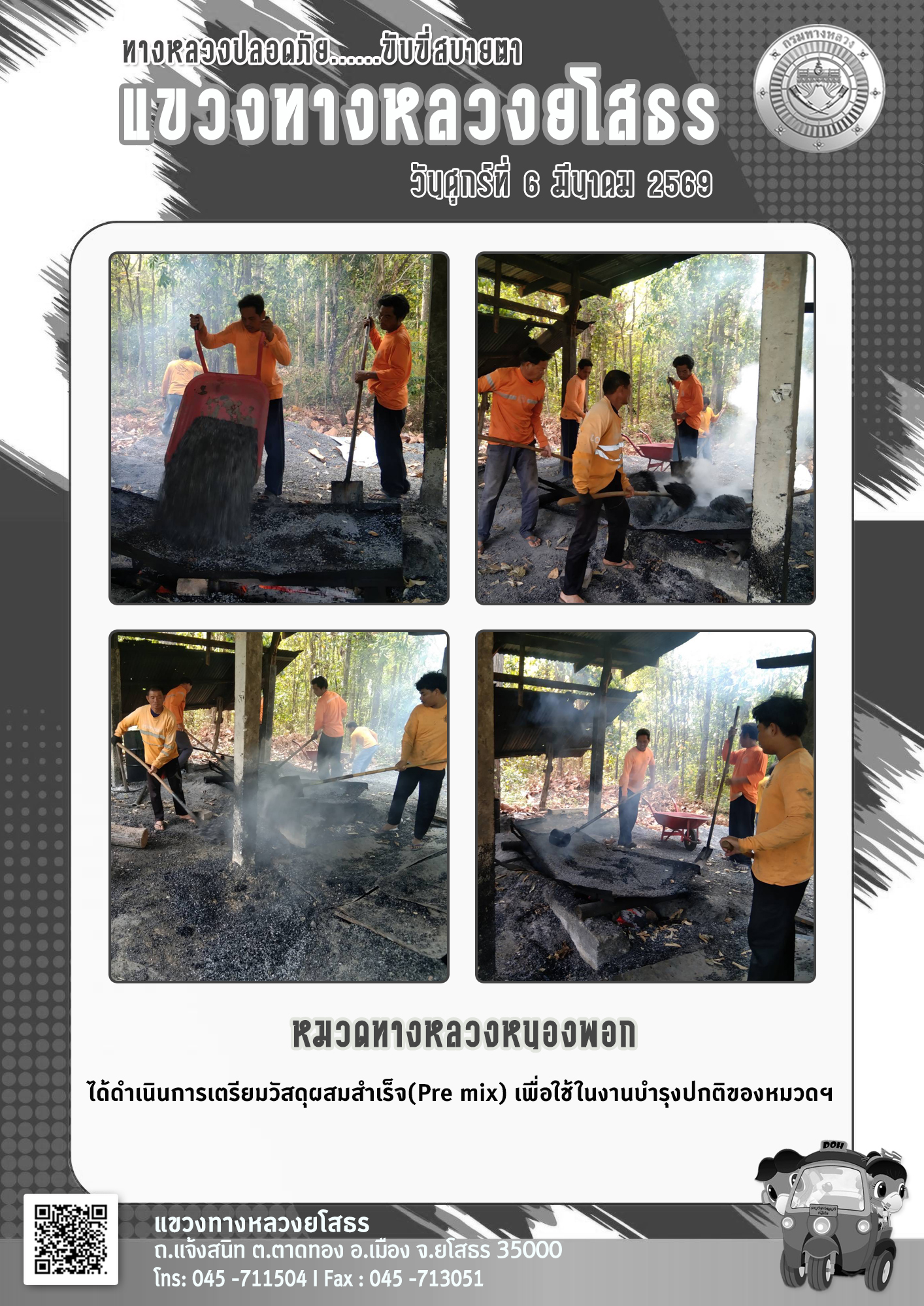 - [10:03] ทั่วไป วันศุกร์ที่ 6 มีนาคม 2569 หมวดทางหลวงยโสธร ได้ดำเนินการเตรียมวัสดุผสมสำเร็จ (Pre mix) เพื่อใช้ในงานบำรุงปกติของหมวดฯ