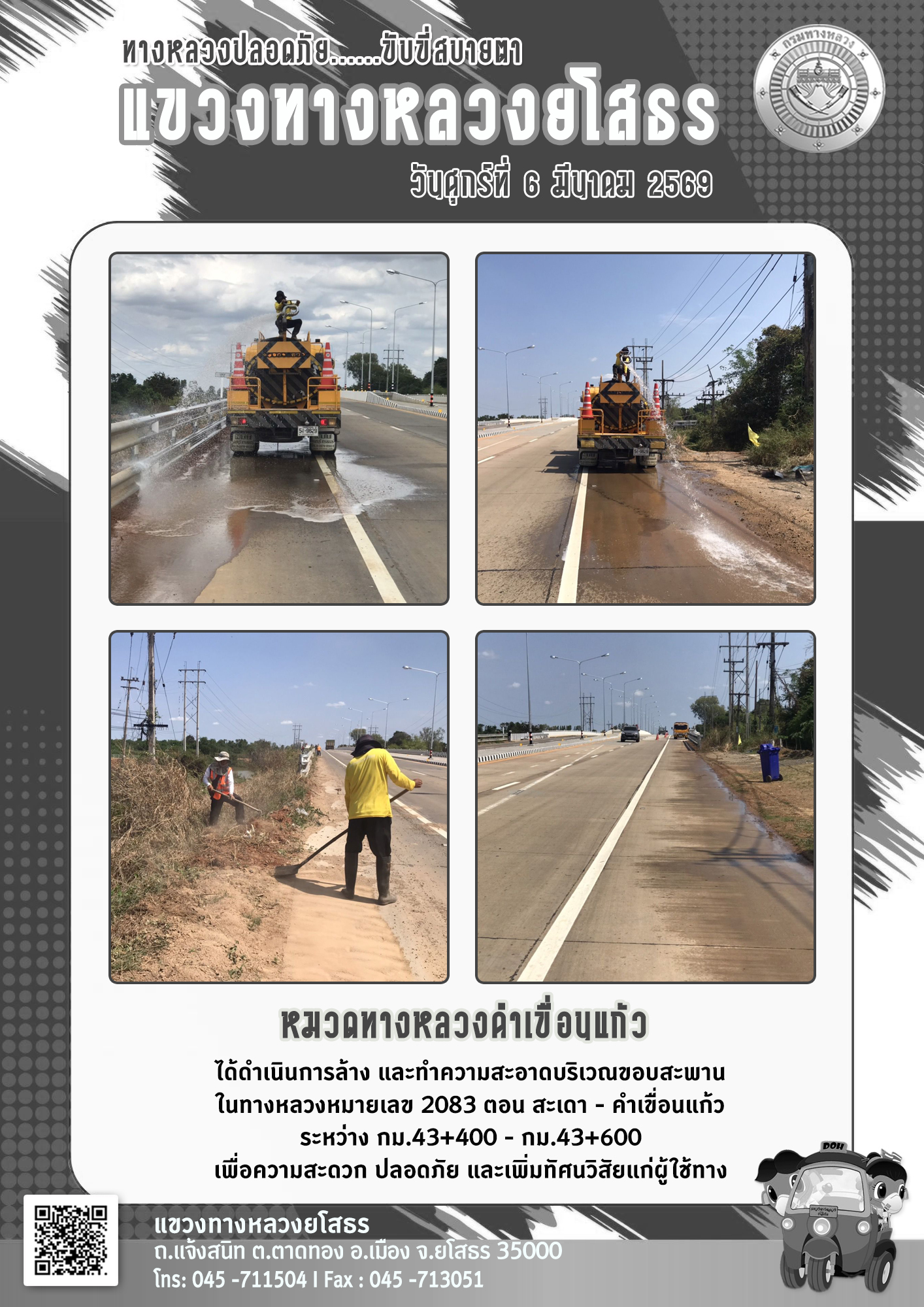 วันศุกร์ที่ 6 มีนาคม 2569 หมวดทางหลวงคำเขื่อนแก้ว ได้ดำเนินการทำความสะอาดบริเวณขอบสะพาน ในทางหลวงหมายเลข 2083 ตอน สะเดา - คำเขื่อนแก้ว ระหว่าง กม.43+400 - กม.43+600 เพื่อความสะดวก ปลอดภัย และเพิ่มทัศนวิสัยแก่ผู้ใช้ทาง