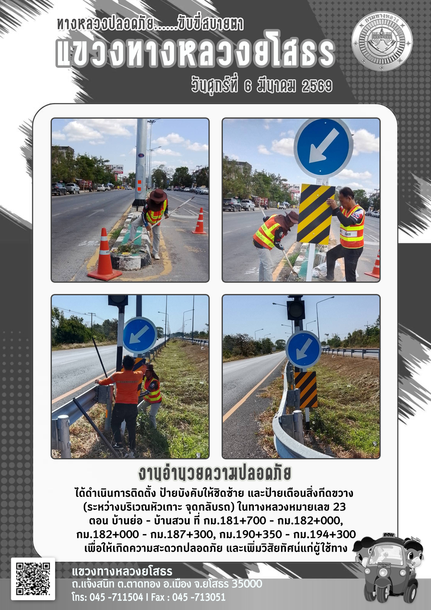 วันศุกร์ที่ 6 มีนาคม 2569 งานอำนวยความปลอดภัย ได้ดำเนินการติดตั้งป้ายบังคับให้ซิดซ้าย และป้ายเตือนสิ่งกีดขวาง (ระหว่างบริเวณหัวเกาะ จุดกลับรถ) เพื่อให้เกิดความสะดวกปลอดภัย และเพิ่มวิสัยทัศน์แก่ผู้ใช้ทาง
