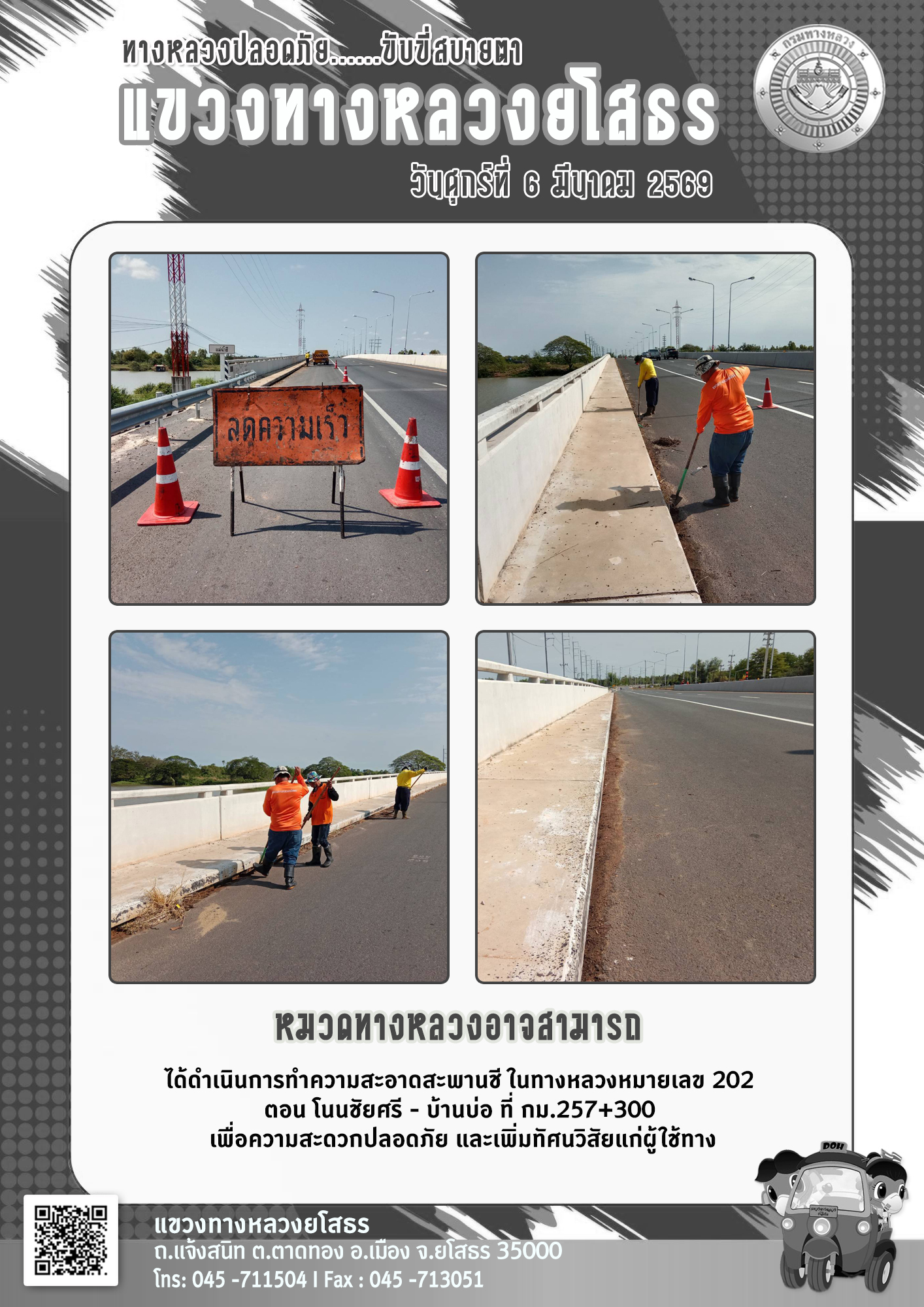 วันศุกร์ที่ 6 มีนาคม 2569 หมวดทางหลวงอาจสามารถ ได้ดำเนินการทำความสะอาดสะพานชี ในทางหลวงหมายเลข 202 ตอน โนนชัยศรี - บ้านบ่อ ที่ กม.257+300 เพื่อความสะดวกปลอดภัย และเพิ่มทัศนวิสัยแก่ผู้ใช้ทาง