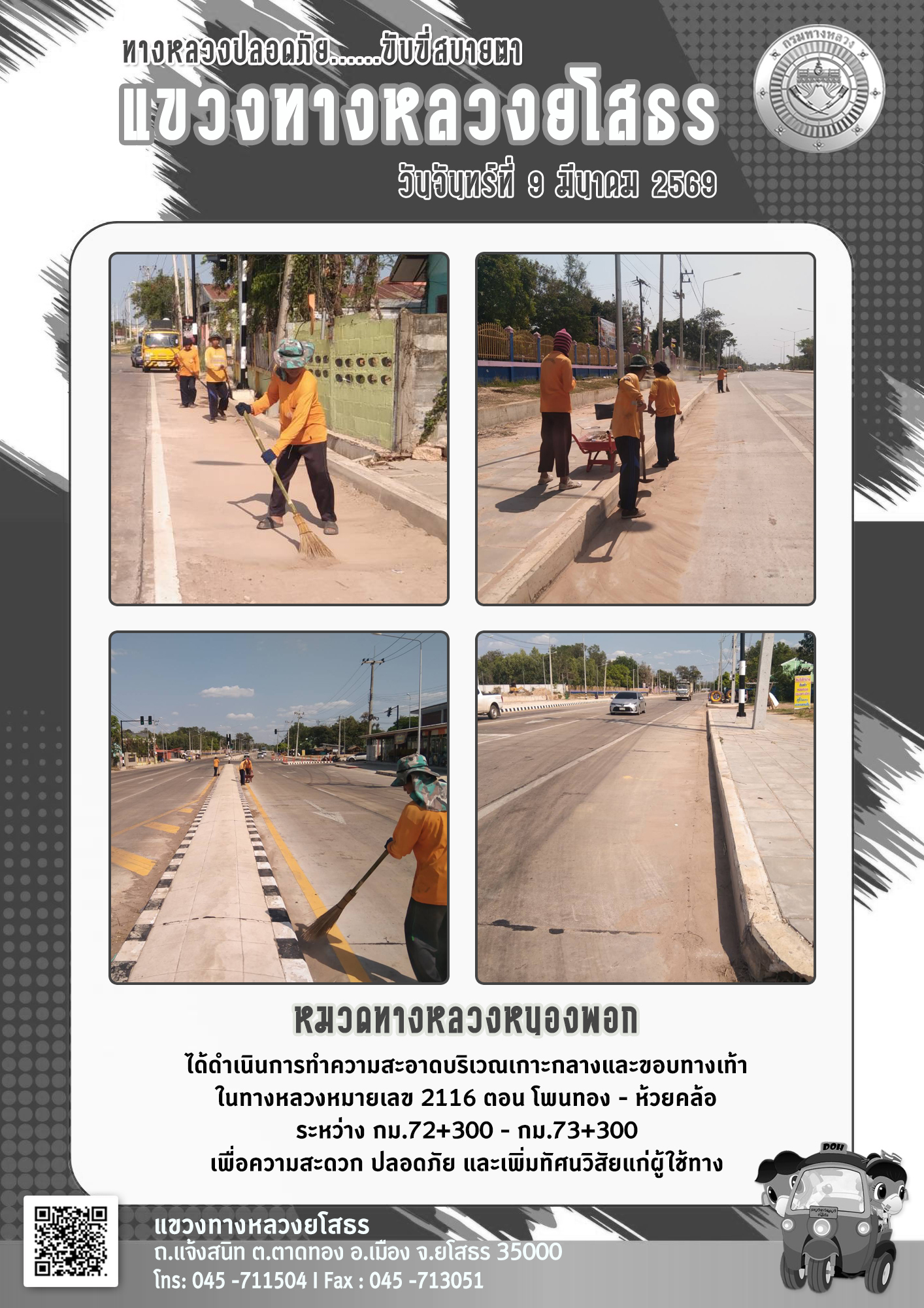 วันจันทร์ที่ 9 มีนาคม 2569 หมวดทางหลวงหนองพอก ได้ดำเนินการทำความสะอาดบริเวณเกาะกลางและขอบทางเท้า ในทางหลวงหมายเลข 2116 ตอน โพนทอง - ห้วยคล้อ ระหว่าง กม.72+300 - กม.73+300 เพื่อความสะดวก ปลอดภัย และเพิ่มทัศนวิสัยแก่ผู้ใช้ทาง