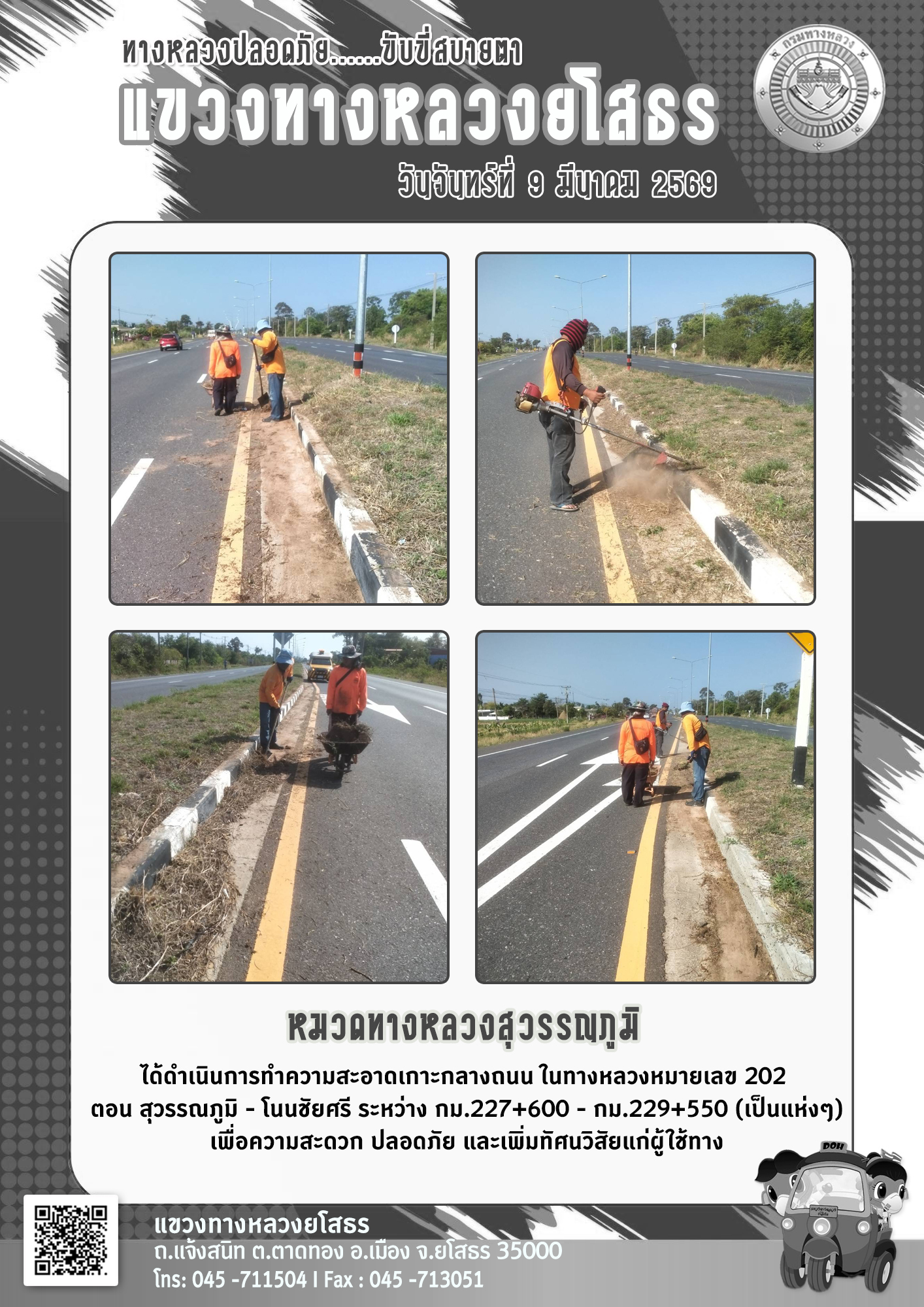 - [14:30] ทั่วไป วันจันทร์ที่ 9 มีนาคม 2569 หมวดทางหลวงสุวรรณภูมิ ได้ดำเนินการทำความสะอาดเกาะกลางถนน ในทางหลวงหมายเลข 202 ตอน สุวรรณภูมิ - โนนชัยศรี ระหว่าง กม.227+600 - กม.229+550 (เป็นแห่งๆ) เพื่อความสะดวก ปลอดภัย และเพิ่มทัศนวิสัยแก่ผู้ใช้ทาง