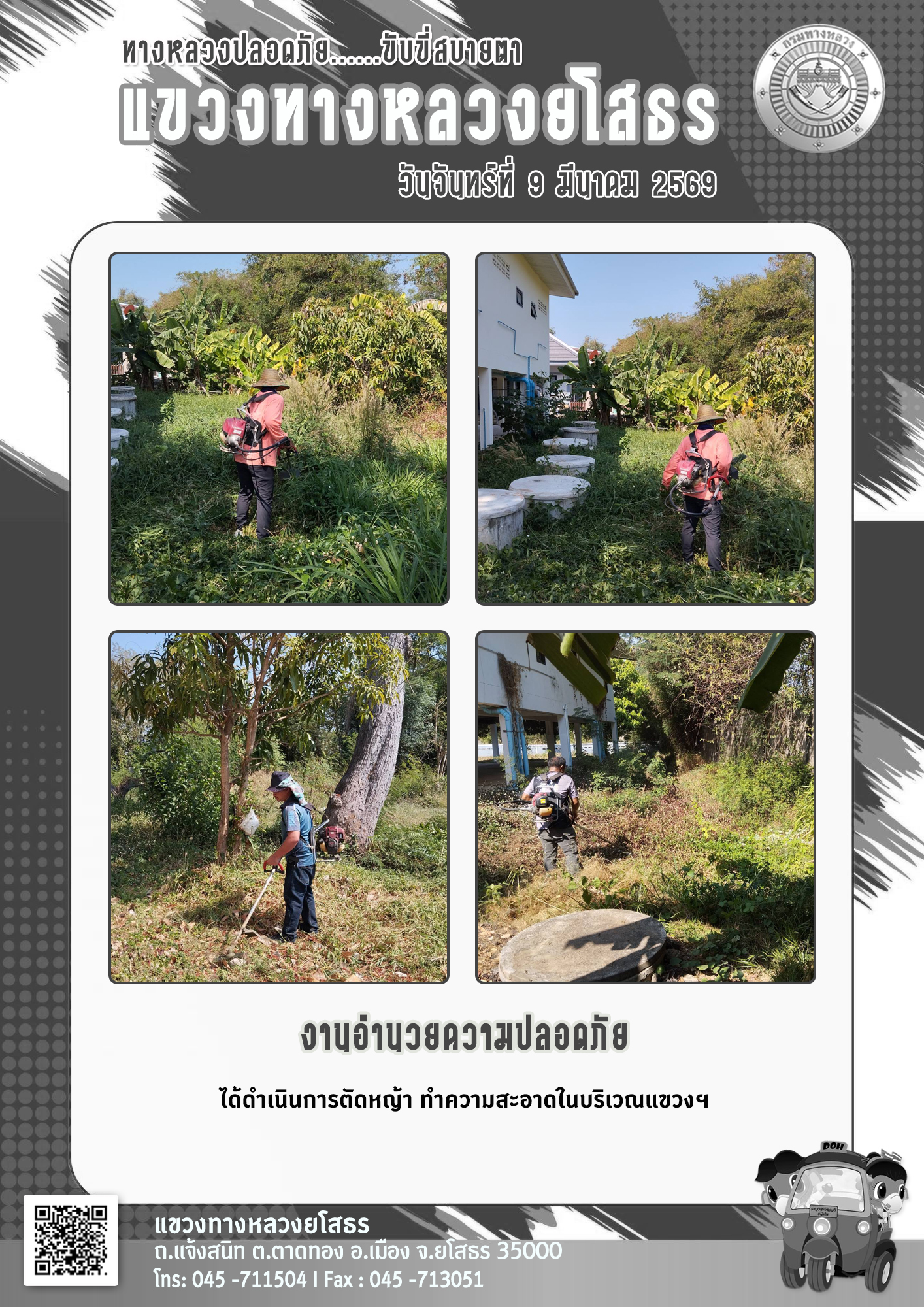 - [14:34] ทั่วไป วันจันทร์ที่ 9 มีนาคม 2569 งานอำนวยความปลอดภัย ได้ดำเนินการตัดหญ้า ทำความสะอาดในบริเวณแขวงฯ