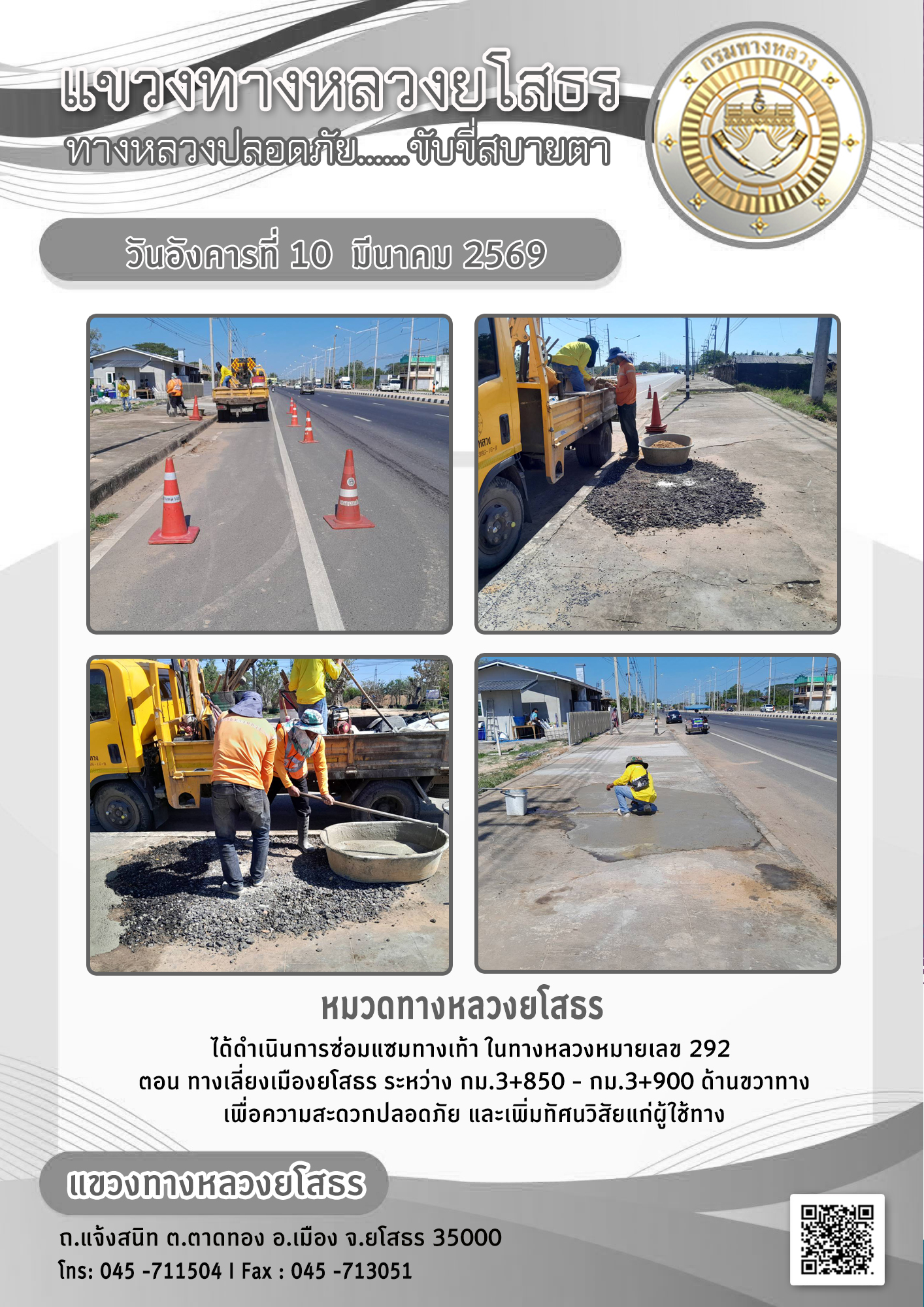 - [14:42] ทั่วไป วันอังคารที่ 10 มีนาคม 2569 หมวดทางหลวงยโสธร ได้ดำเนินการซ่อมแซมทางเท้า ในทางหลวงหมายเลข 292 ตอน ทางเลี่ยงเมืองยโสธร ระหว่าง กม.3+850 - กม.3+900 ด้านขวาทาง เพื่อความสะดวกปลอดภัย และเพิ่มทัศนวิสัยแก่ผู้ใช้ทาง