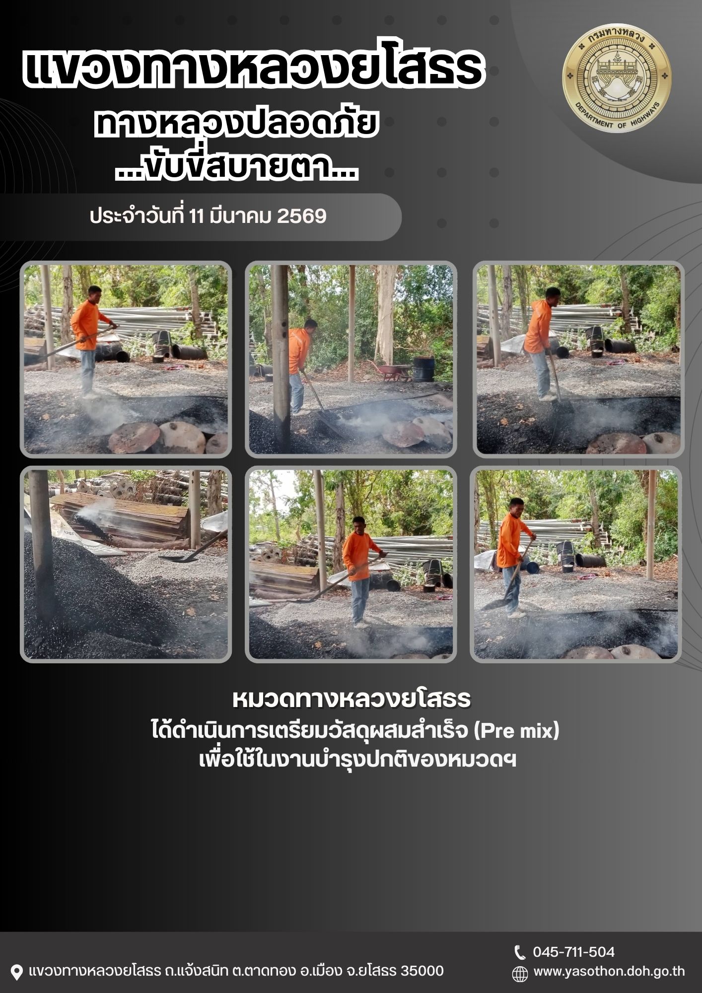 - [14:46] ทั่วไป วันที่ 11 มีนาคม 2569 หมวดทางหลวงยโสธร ได้ดำเนินการเตรียมวัสดุผสมสำเร็จ (Pre mix) เพื่อใช้ในงานบำรุงปกติของหมวดฯ