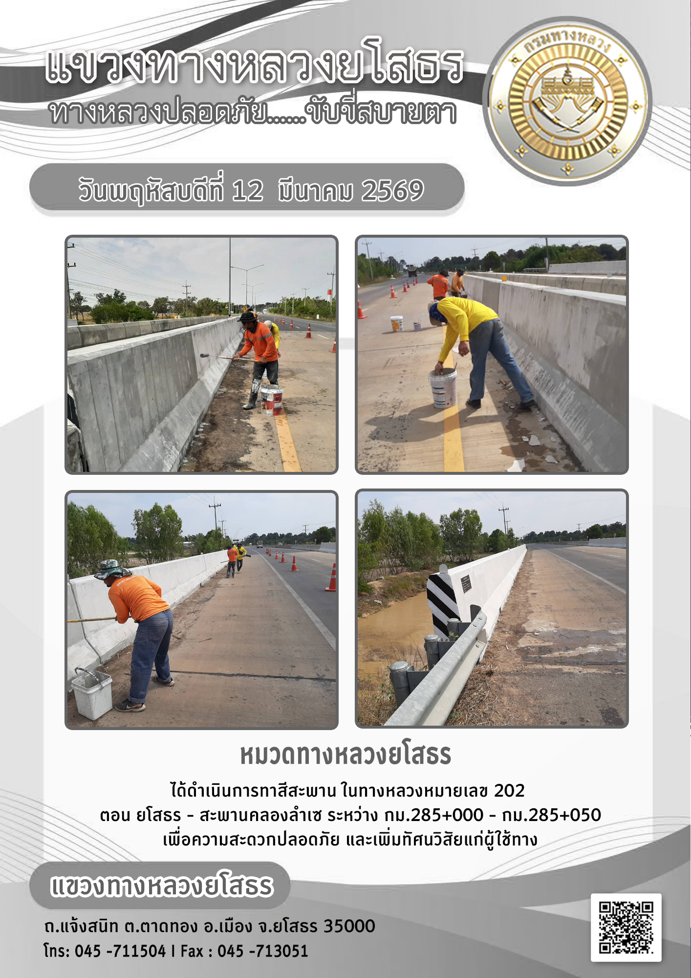 วันพฤหัสบดีที่ 12 มีนาคม 2569 หมวดทางหลวงยโสธร ได้ดำเนินการทาสีสะพาน ในทางหลวงหมายเลข 202 ตอน ยโสธร - สะพานคลองลำเซ ระหว่าง กม.285+000 - กม.285+050 เพื่อความสะดวกปลอดภัย และเพิ่มทัศนวิสัยแก่ผู้ใช้ทาง