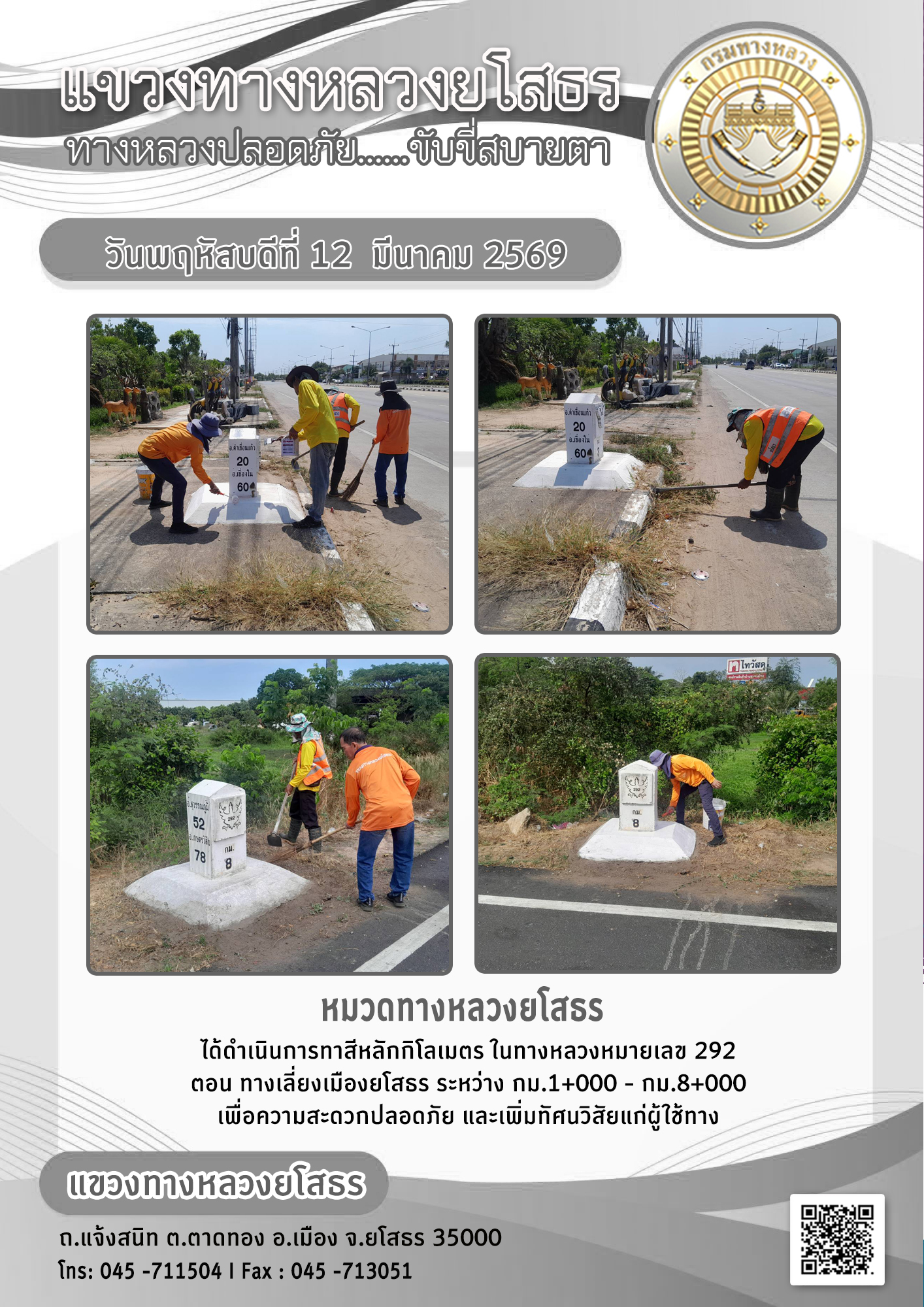 - [10:08] ทั่วไป วันพฤหัสบดีที่ 12 มีนาคม 2569 หมวดทางหลวงยโสธร ได้ดำเนินการทาสีหลักกิโลเมตร ในทางหลวงหมายเลข 292 ตอน ทางเลี่ยงเมืองยโสธร ระหว่าง กม.1+000 - กม.8+000 เพื่อความสะดวกปลอดภัย และเพิ่มทัศนวิสัยแก่ผู้ใช้ทาง