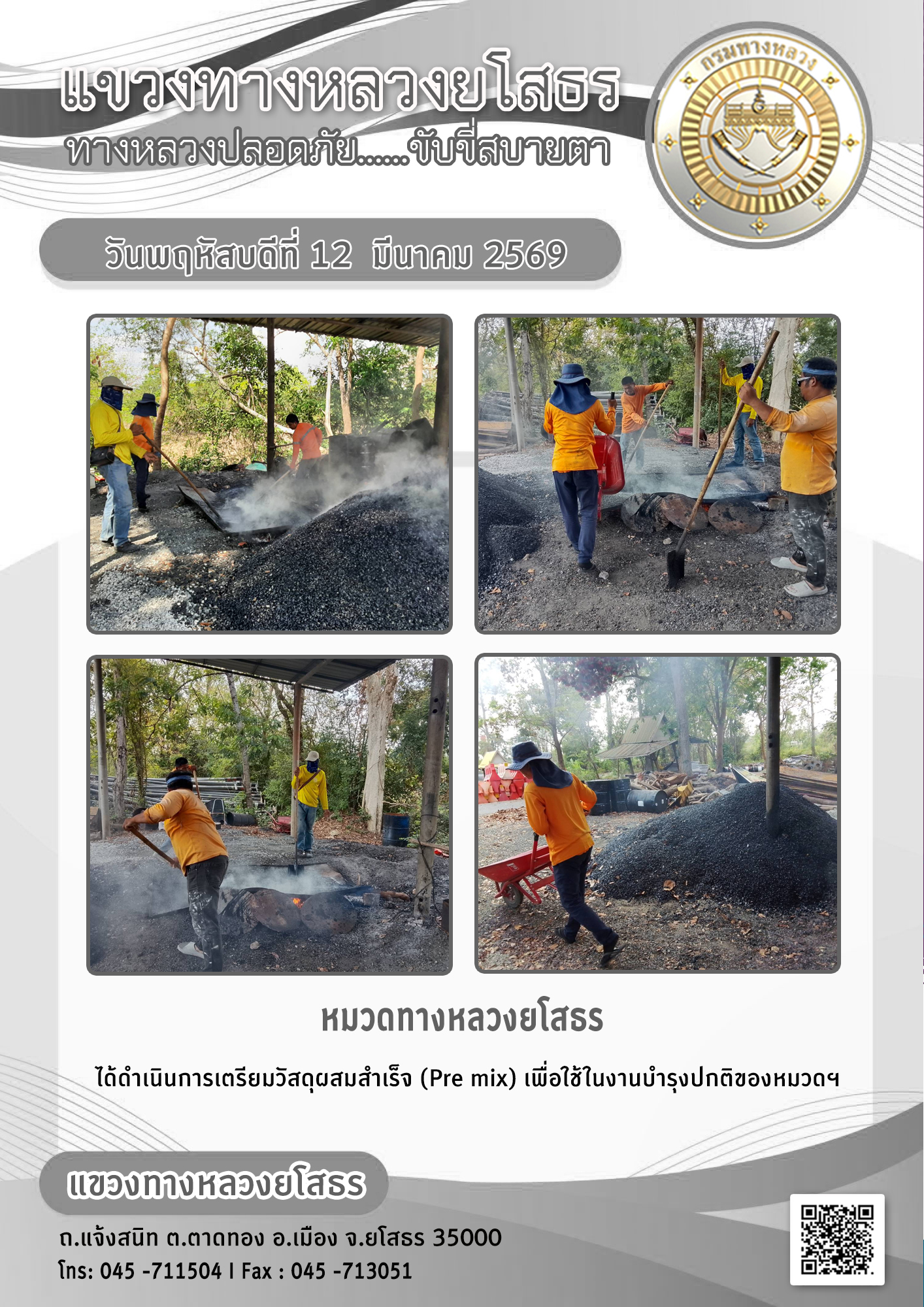 - [10:09] ทั่วไป วันพฤหัสบดีที่ 12 มีนาคม 2569 หมวดทางหลวงยโสธร ได้ดำเนินการเตรียมวัสดุผสมสำเร็จ (Pre mix) เพื่อใช้ในงานบำรุงปกติของหมวดฯ