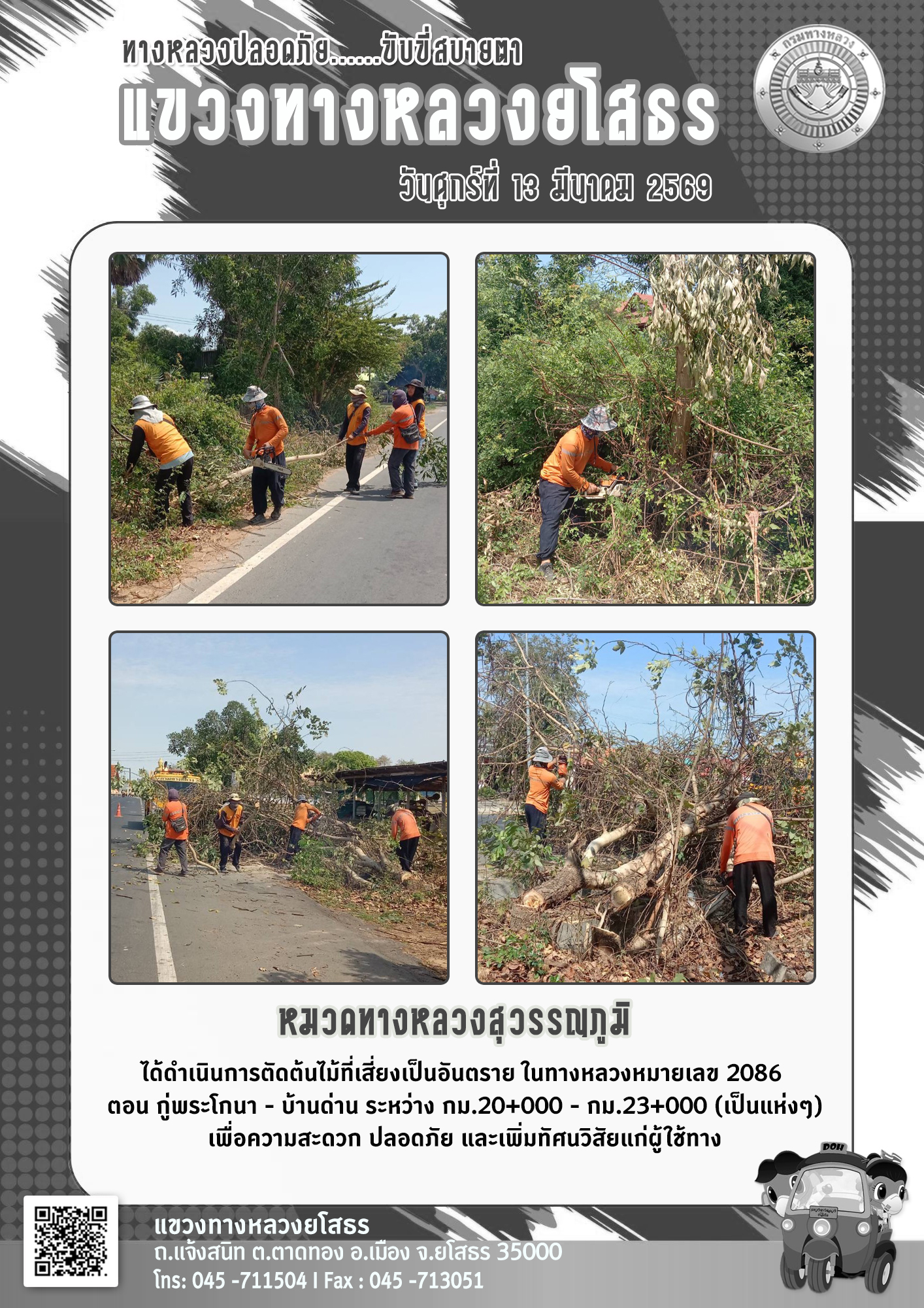 วันศุกร์ที่ 13 มีนาคม 2569 หมวดทางหลวงสุวรรณภูมิ ได้ดำเนินการตัดต้นไม้ที่เสี่ยงเป็นอันตราย ในทางหลวงหมายเลข 2086 ตอน กู่พระโกนา - บ้านด่าน ระหว่าง กม.20+000 - กม.23+000 (เป็นแห่งๆ) เพื่อความสะดวก ปลอดภัย และเพิ่มทัศนวิสัยแก่ผู้ใช้ทาง