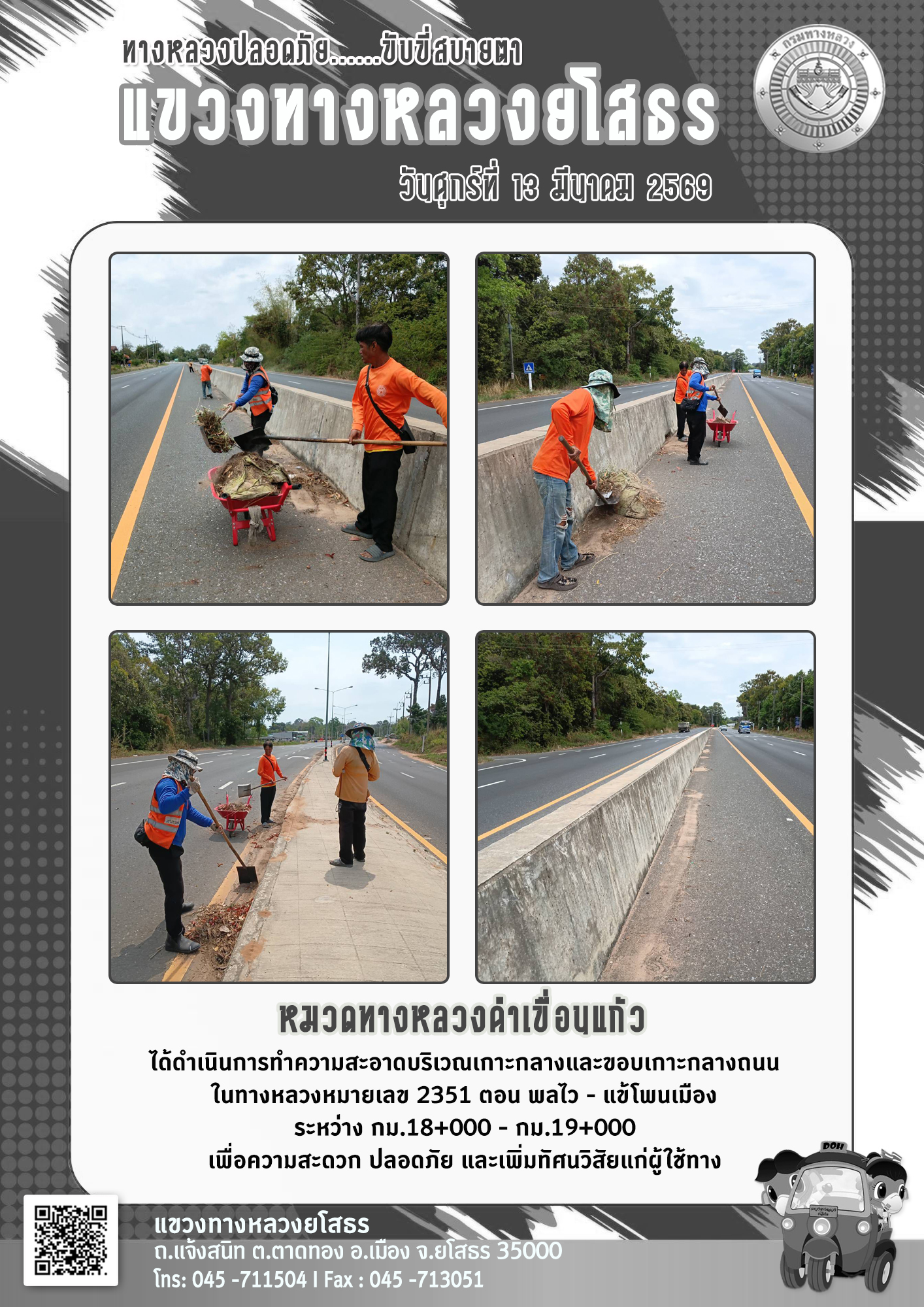 วันศุกร์ที่ 13 มีนาคม 2569 หมวดทางหลวงคำเขื่อนแก้ว ได้ดำเนินการทำความสะอาดบริเวณเกาะกลางและขอบเกาะกลางถนน ในทางหลวงหมายเลข 2351 ตอน พลไว - แข้โพนเมือง ระหว่าง กม.18+000 - กม.19+000 เพื่อความสะดวก ปลอดภัย และเพิ่มทัศนวิสัยแก่ผู้ใช้ทาง