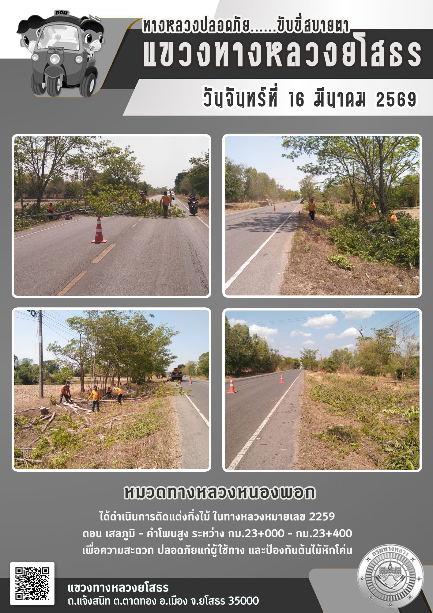 วันจันทร์ที่ 16 มีนาคม 2569 หมวดทางหลวงหนองพอก ได้ดำเนินการตัดแต่งกิ่งไม้ ในทางหลวงหมายเลข 2259 ตอน เสลภูมิ - คำโพนสูง ระหว่าง กม.23+000 - กม.23+400 เพื่อความสะดวก ปลอดภัยแก่ผู้ใช้ทาง และป้องกันกันต้นไม้หักโค่น