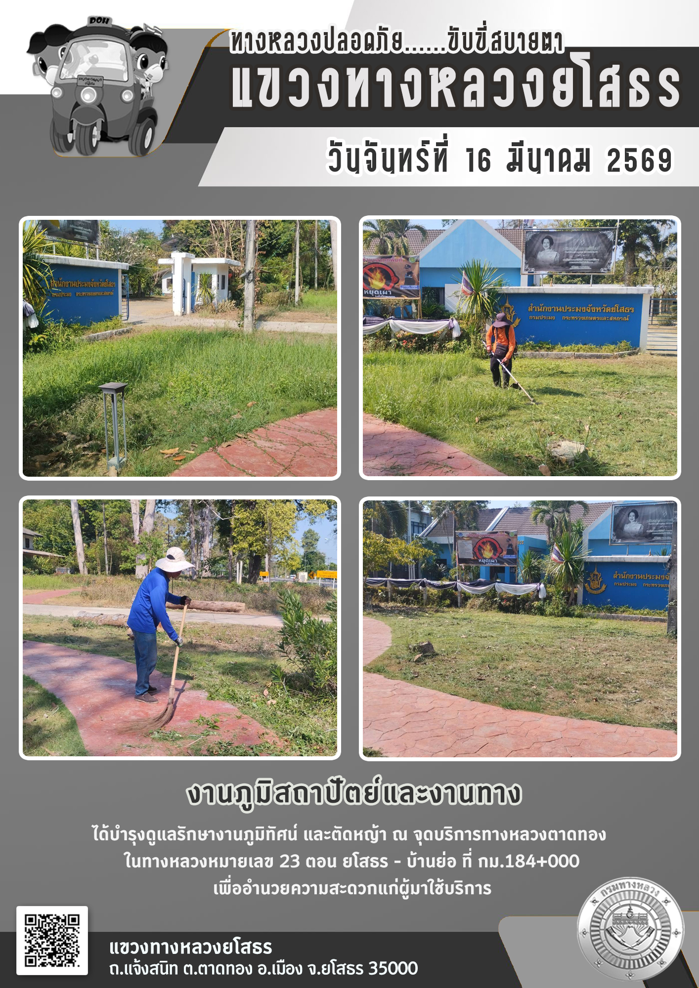 วันจันทร์ที่ 16 มีนาคม 2569 งานภูมิสถาปัตย์และงานทาง ได้บำรุงดูแลรักษางานภูมิทัศน์ และตัดหญ้า ณ จุดบริการทางหลวงตาดทอง ในทางหลวงหมายเลข 23 ตอน ยโสธร - บ้านย่อ ที่ กม.184+000 เพื่ออำนวยความสะดวกแก่ผู้มาใช้บริการ