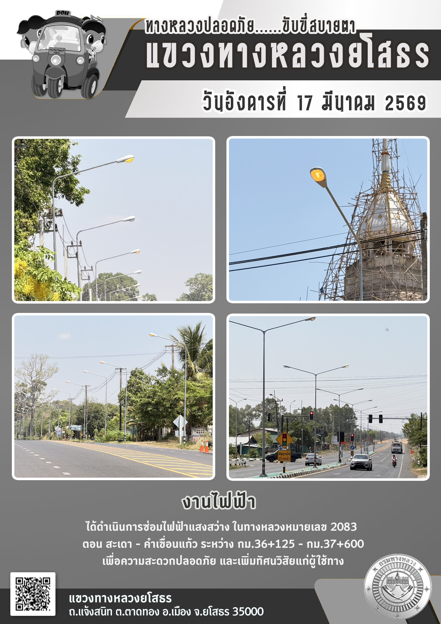 - [11:44] ทั่วไป วันอังคารที่ 17 มีนาคม 2569 งานไฟฟ้า ได้ดำเนินการซ่อมไฟฟ้าแสงสว่าง ในทางหลวงหมายเลข 2169 ตอน ยโสธร - กุดชุม ระหว่าง กม.36+200 - กม.36+400 เพื่อความสะดวกปลอดภัย และเพิ่มทัศนวิสัยแก่ผู้ใช้ทาง