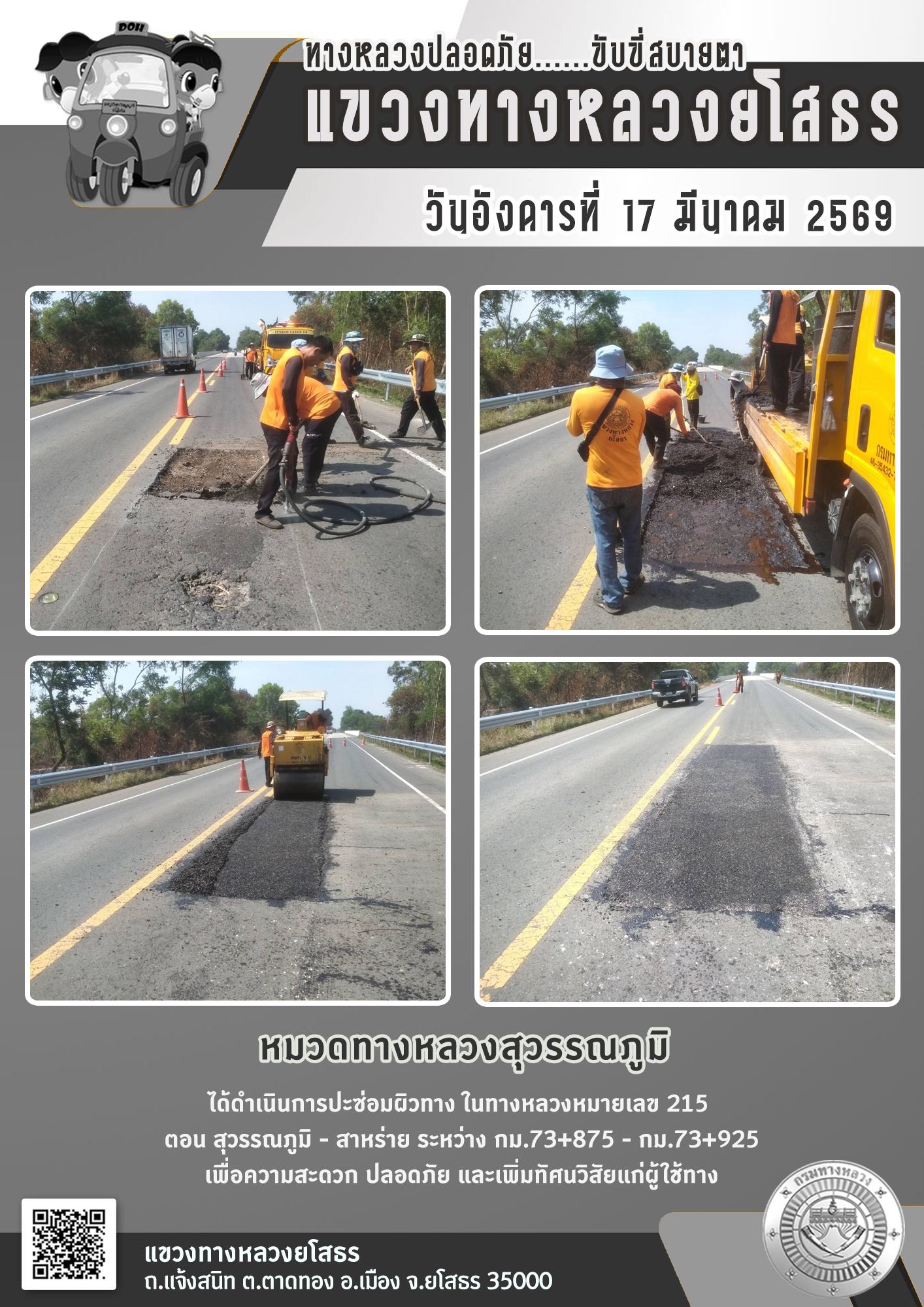 วันอังคารที่ 17 มีนาคม 2569 หมวดทางหลวงสุวรรณภูมิ ได้ดำเนินการปะซ่อมผิวทาง ในทางหลวงหมายเลข 215 ตอน สุวรรณภูมิ - สาหร่าย ระหว่าง กม.73+875 - กม.73+925 เพื่อความสะดวก ปลอดภัย และเพิ่มทัศนวิสัยแก่ผู้ใช้ทาง