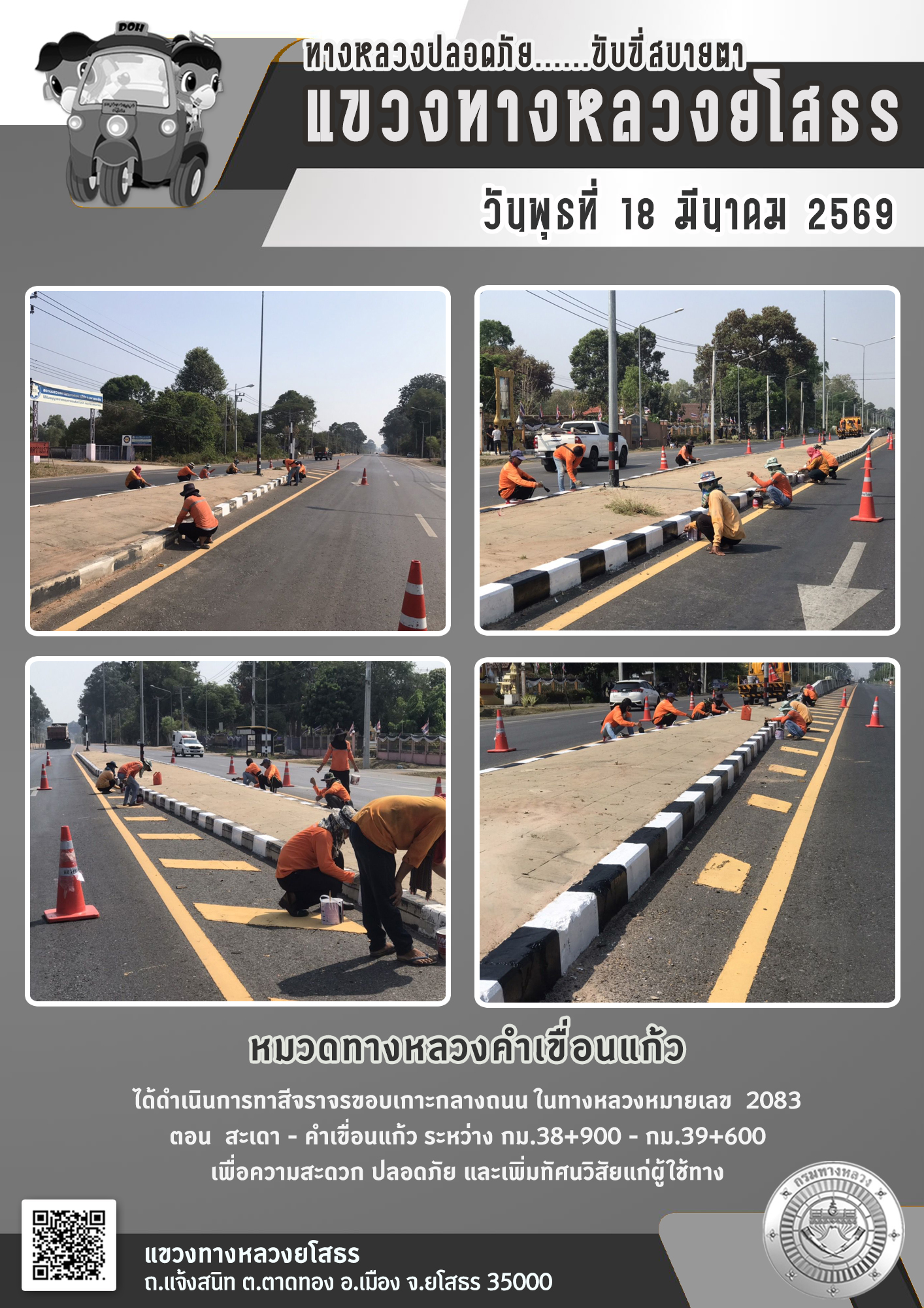 - [14:00] ทั่วไป วันพุธที่ 18 มีนาคม 2569 หมวดทางหลวงคำเขื่อนแก้ว ได้ดำเนินการทาสีจราจรขอบเกาะกลางถนน ในทางหลวงหมายเลข 2083 ตอน สะเดา - คำเขื่อนแก้ว ระหว่าง กม.38+900 - กม.39+600 เพื่อความสะดวก ปลอดภัย และเพิ่มทัศนวิสัยแก่ผู้ใช้ทาง