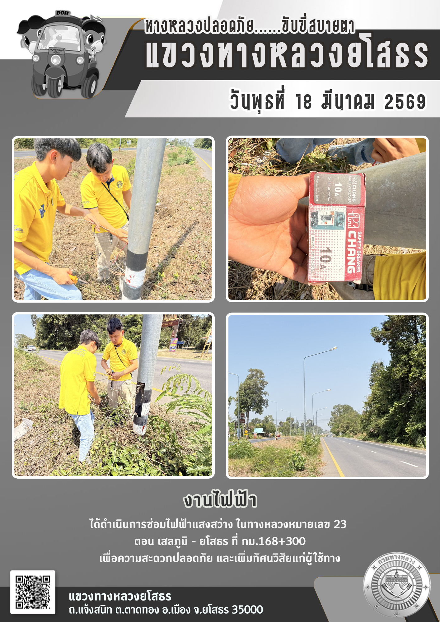 วันพุธที่ 18 มีนาคม 2569 งานไฟฟ้า ได้ดำเนินการซ่อมไฟฟ้าแสงสว่าง ในทางหลวงหมายเลข 23 ตอน เสลภูมิ - ยโสธร ที่ กม.168+300 เพื่อความสะดวกปลอดภัย และเพิ่มทัศนวิสัยแก่ผู้ใช้ทาง